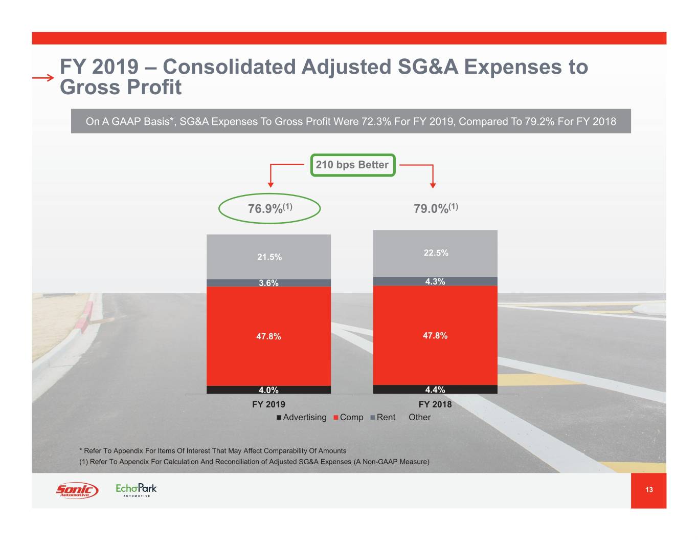 FY 2019 – Consolidated Continuing Operations Revenue Gross Profit Segment Income (Loss)* $9.1 $1,162 $112 $700 $58 In Millions ($52.6) $211.3 $9,252 $9,292 $1,388 $1,409 $157.4 FY 2018 FY 2019 FY 2018 FY 2019 FY 2018 FY 2019 Total Revenue Up 5.1% Total Gross Profit Up 5.2% Adjusted EBITDA(1) Up 19.0% Franchised EchoPark On A GAAP Basis*, FY 2019 Earnings Per Diluted Share From Continuing Operations of $3.31, Up 171% Compared To FY 2018 * Refer To Appendix For Items Of Interest That May Affect Comparability Of Amounts (1) Refer To Appendix For Calculation And Reconciliation of Adjusted EBITDA (A Non-GAAP Measure) 12