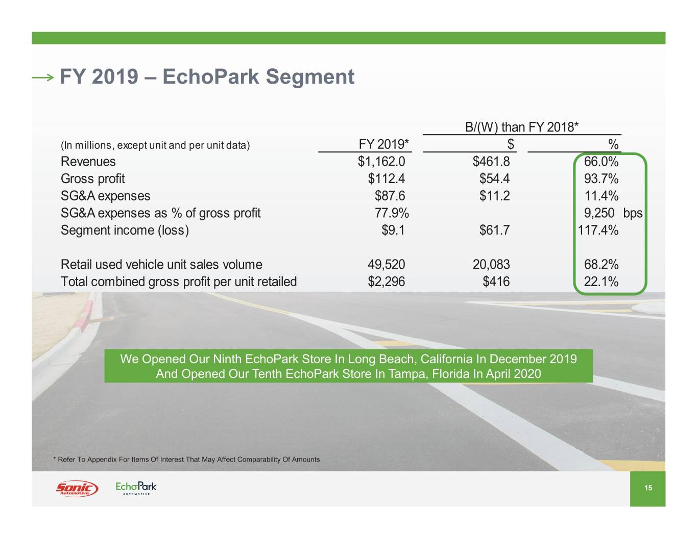 FY 2019 – Franchised Dealerships Segment B/(W) than FY 2018* (In millions, except unit and per unit data) FY 2019* $ % Revenues $9,292.3 $40.9 0.4% Gross profit $1,408.6 $20.5 1.5% SG&A expenses $1,011.8 $34.7 3.3% SG&A expenses as % of gross profit 71.8% 360 bps Segment income (loss) $211.4 $53.9 34.2% New vehicle unit sales volume 114,131 (8,586) (7.0%) Retail used vehicle unit sales volume 112,629 2,461 2.2% New vehicle gross profit per unit $2,042 $74 3.8% Retail used vehicle gross profit per unit $1,310 ($37) (2.7%) F&I gross profit per unit retailed $1,620 $128 8.6% 2019 Comparative Results Reflect the Disposition of 10 Franchises During 2019 That Generated $656 Million of Revenue in FY 2018 * Refer To Appendix For Items Of Interest That May Affect Comparability Of Amounts 14