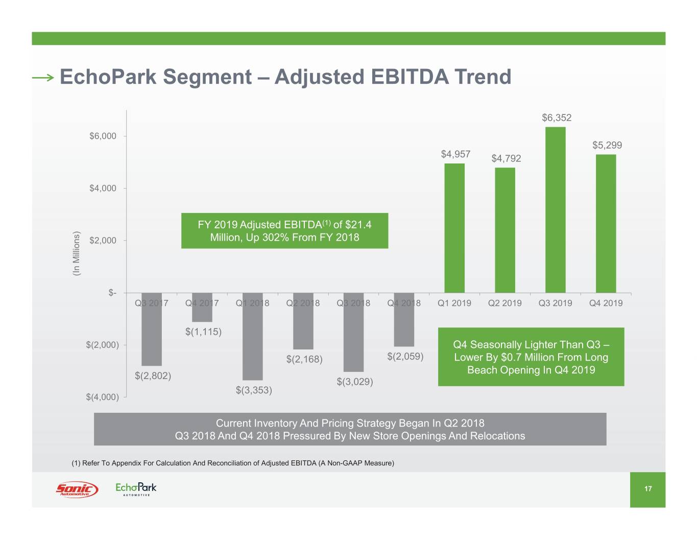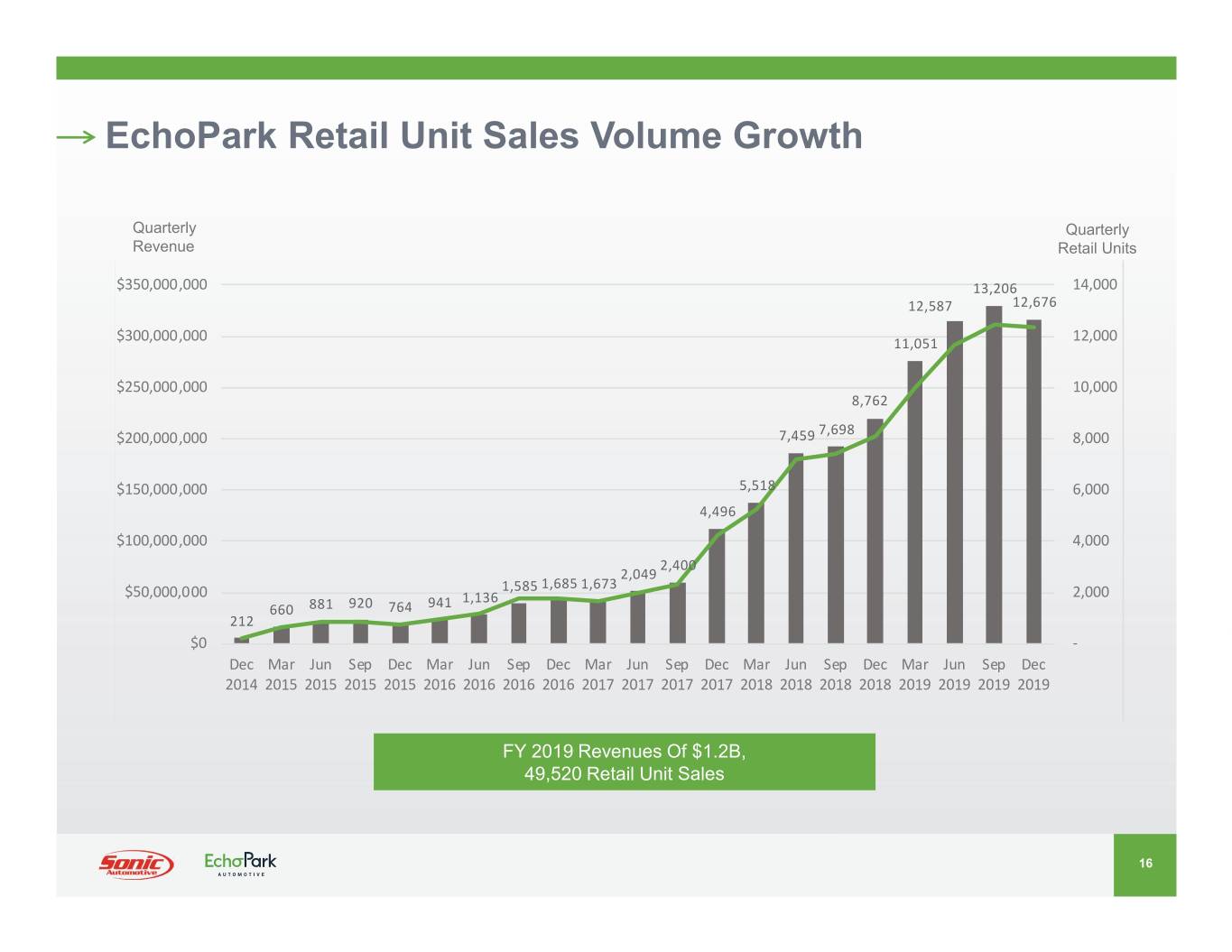 EchoPark Retail Unit Sales Volume Growth Quarterly Quarterly Revenue Retail Units $350,000,000 13,206 14,000 12,587 12,676 $300,000,000 11,051 12,000 $250,000,000 10,000 8,762 7,698 $200,000,000 7,459 8,000 $150,000,000 5,518 6,000 4,496 $100,000,000 4,000 2,400 2,049 1,585 1,685 1,673 $50,000,000 1,136 2,000 660 881 920 764 941 212 $0 - Dec Mar Jun Sep Dec Mar Jun Sep Dec Mar Jun Sep Dec Mar Jun Sep Dec Mar Jun Sep Dec 2014 2015 2015 2015 2015 2016 2016 2016 2016 2017 2017 2017 2017 2018 2018 2018 2018 2019 2019 2019 2019 FY 2019 Revenues Of $1.2B, 49,520 Retail Unit Sales 16