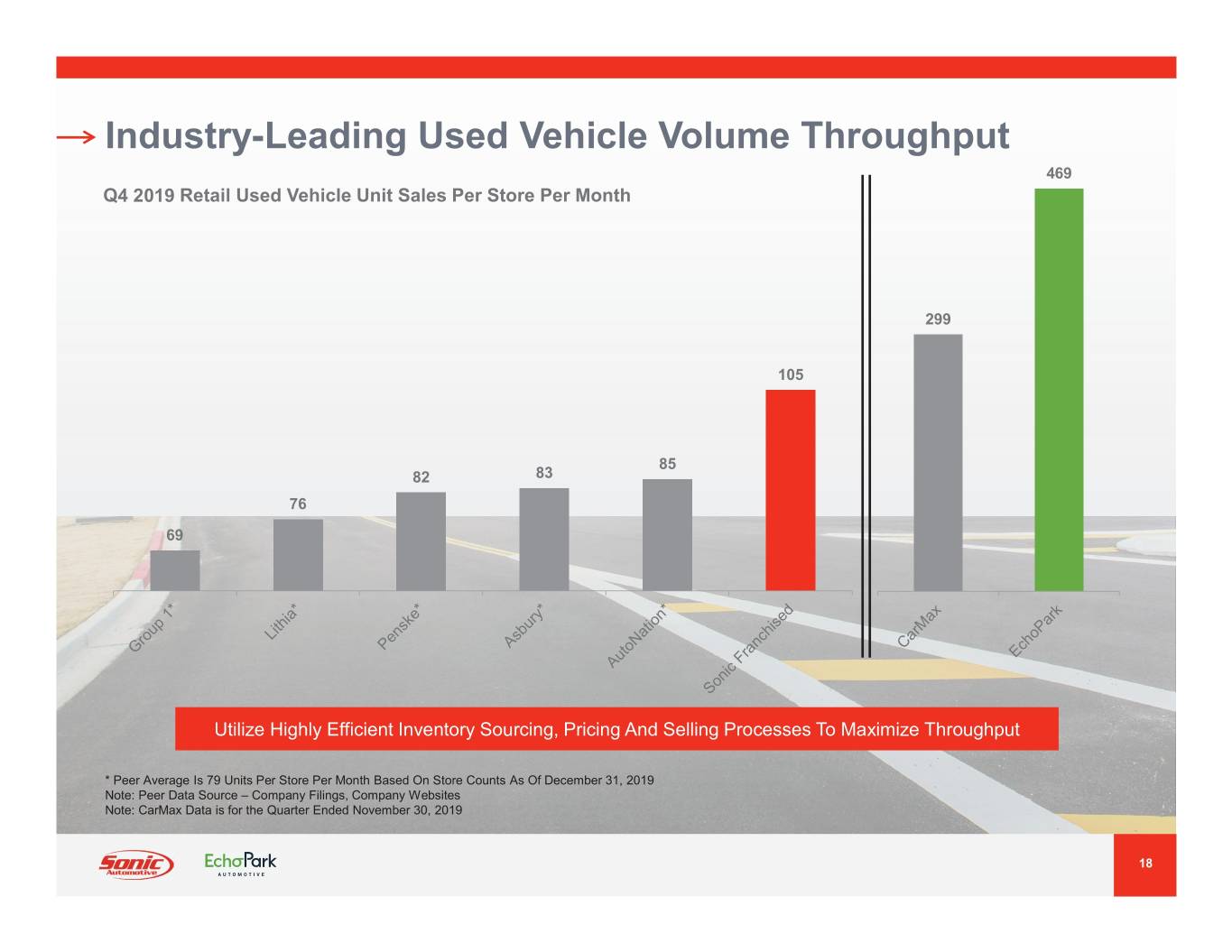 EchoPark Segment – Adjusted EBITDA Trend $6,352 $6,000 $5,299 $4,957 $4,792 $4,000 FY 2019 Adjusted EBITDA(1) of $21.4 $2,000 Million, Up 302% From FY 2018 (In Millions) $- Q3 2017 Q4 2017 Q1 2018 Q2 2018 Q3 2018 Q4 2018 Q1 2019 Q2 2019 Q3 2019 Q4 2019 $(1,115) $(2,000) Q4 Seasonally Lighter Than Q3 – $(2,168) $(2,059) Lower By $0.7 Million From Long Beach Opening In Q4 2019 $(2,802) $(3,029) $(3,353) $(4,000) Current Inventory And Pricing Strategy Began In Q2 2018 Q3 2018 And Q4 2018 Pressured By New Store Openings And Relocations (1) Refer To Appendix For Calculation And Reconciliation of Adjusted EBITDA (A Non-GAAP Measure) 17