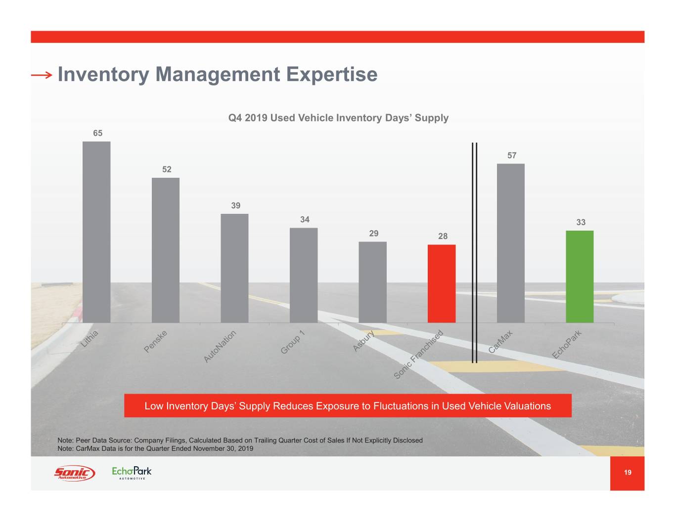 Industry-Leading Used Vehicle Volume Throughput 469 Q4 2019 Retail Used Vehicle Unit Sales Per Store Per Month 299 105 85 82 83 76 69 Utilize Highly Efficient Inventory Sourcing, Pricing And Selling Processes To Maximize Throughput * Peer Average Is 79 Units Per Store Per Month Based On Store Counts As Of December 31, 2019 Note: Peer Data Source – Company Filings, Company Websites Note: CarMax Data is for the Quarter Ended November 30, 2019 18