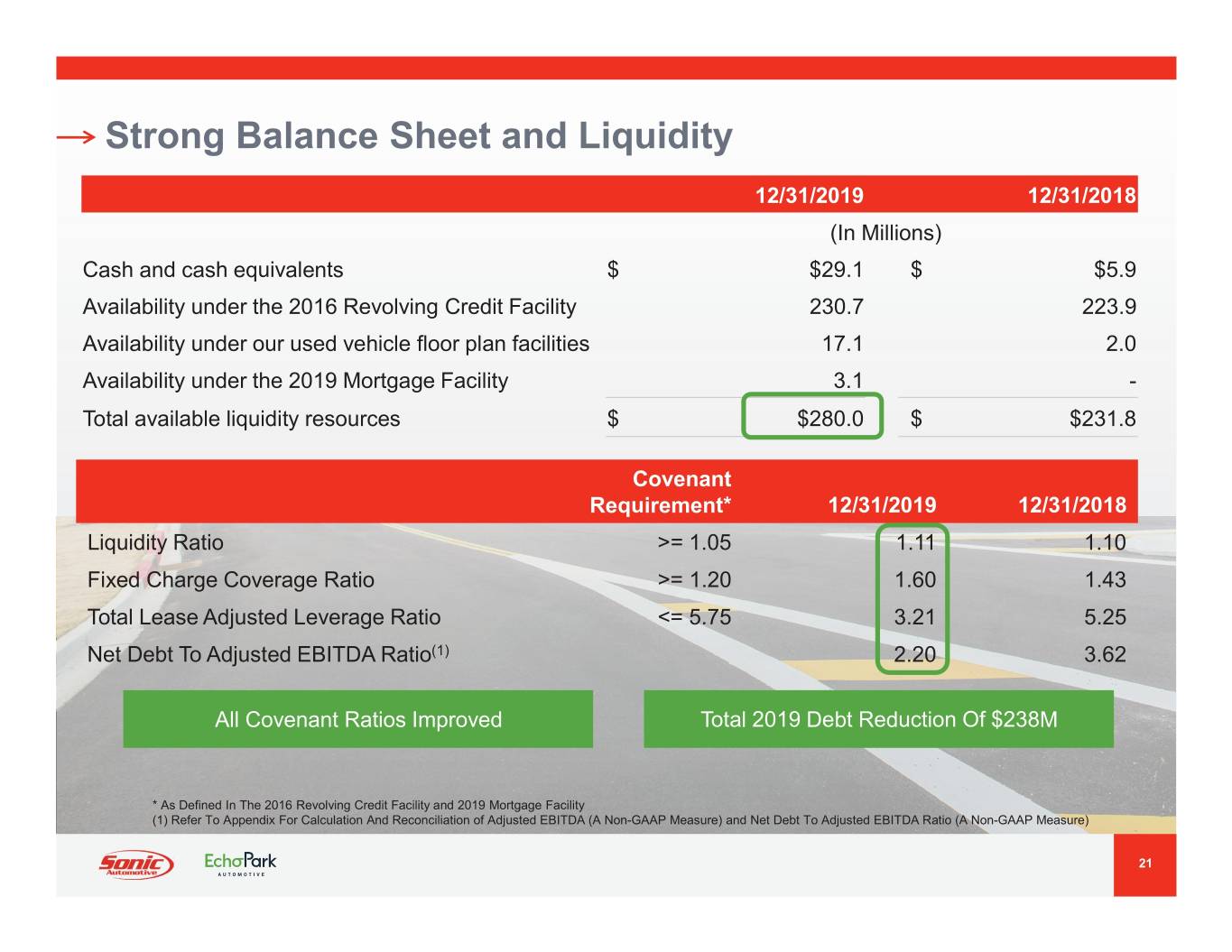 Strong Balance Sheet and Liquidity 12/31/2019 12/31/2018 (In Millions) Cash and cash equivalents $ $29.1 $ $5.9 Availability under the 2016 Revolving Credit Facility 230.7 223.9 Availability under our used vehicle floor plan facilities 17.1 2.0 Availability under the 2019 Mortgage Facility 3.1 - Total available liquidity resources $ $280.0 $ $231.8 Covenant Requirement* 12/31/2019 12/31/2018 Liquidity Ratio >= 1.05 1.11 1.10 Fixed Charge Coverage Ratio >= 1.20 1.60 1.43 Total Lease Adjusted Leverage Ratio <= 5.75 3.21 5.25 Net Debt To Adjusted EBITDA Ratio(1) 2.20 3.62 All Covenant Ratios Improved Total 2019 Debt Reduction Of $238M * As Defined In The 2016 Revolving Credit Facility and 2019 Mortgage Facility (1) Refer To Appendix For Calculation And Reconciliation of Adjusted EBITDA (A Non-GAAP Measure) and Net Debt To Adjusted EBITDA Ratio (A Non-GAAP Measure) 21