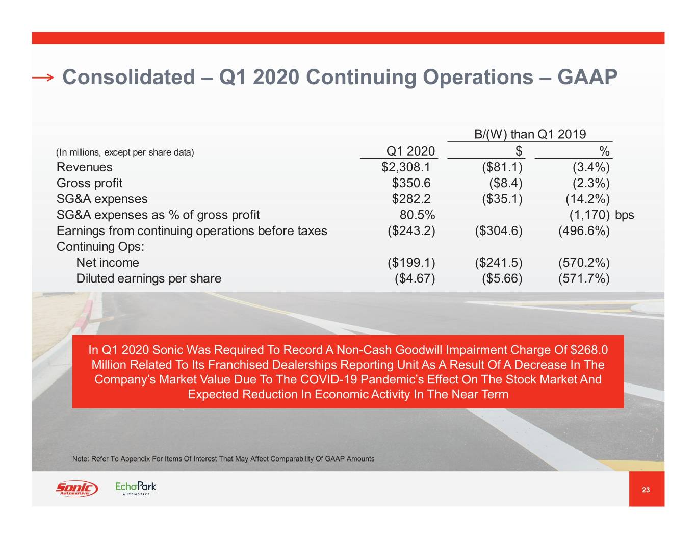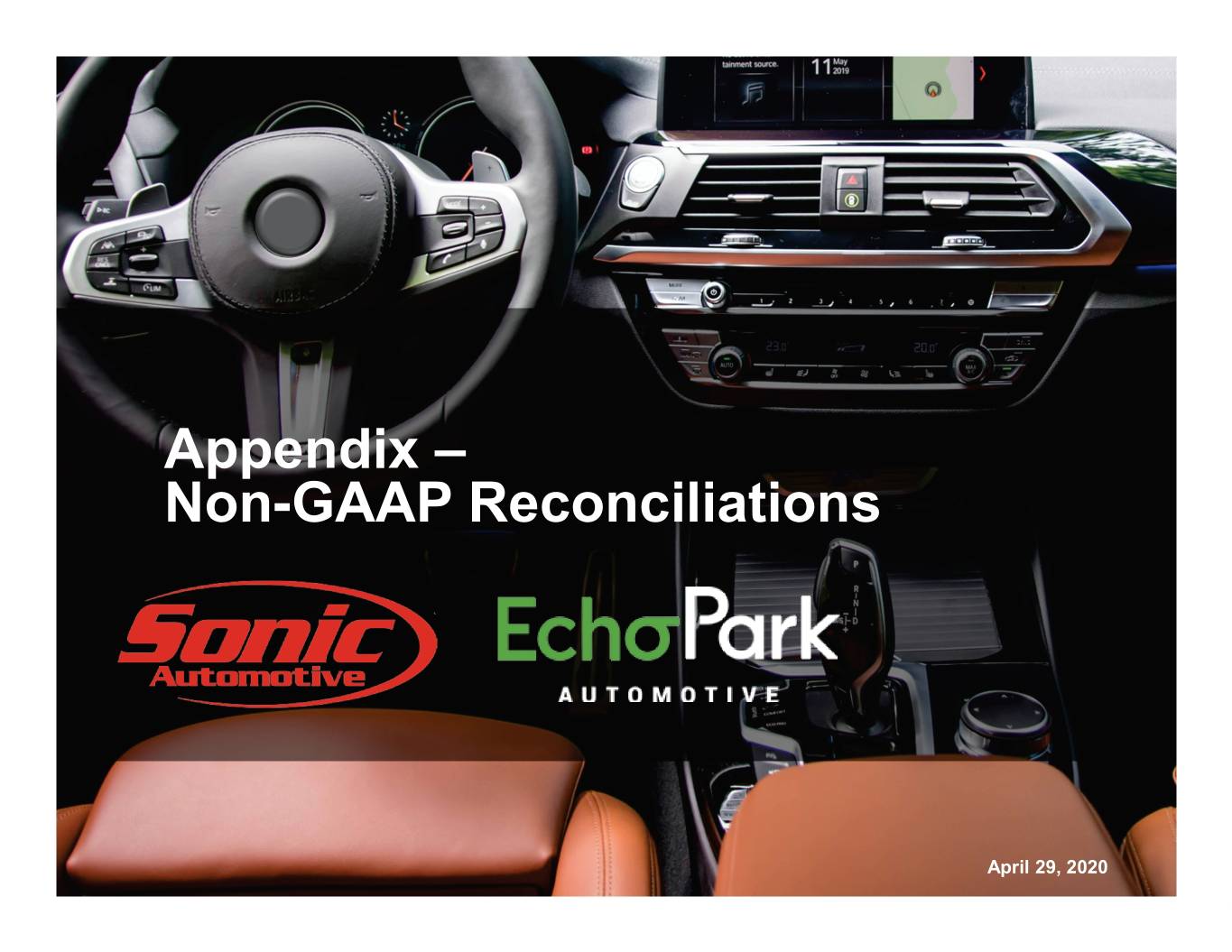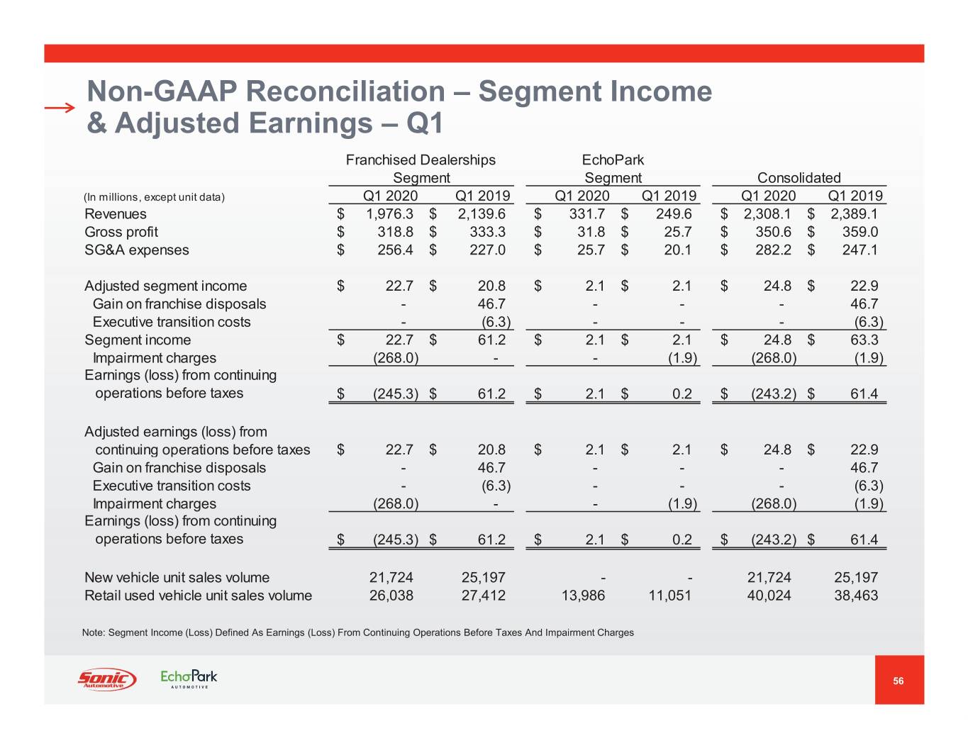 Non-GAAP Reconciliation – Segment Income & Adjusted Earnings – Q1 Franchised Dealerships EchoPark Segment Segment Consolidated (In millions, except unit data) Q1 2020 Q1 2019 Q1 2020 Q1 2019 Q1 2020 Q1 2019 Revenues$ 1,976.3 $ 2,139.6 $ 331.7 $ 249.6 $ 2,308.1 $ 2,389.1 Gross profit$ 318.8 $ 333.3 $ 31.8 $ 25.7 $ 350.6 $ 359.0 SG&A expenses$ 256.4 $ 227.0 $ 25.7 $ 20.1 $ 282.2 $ 247.1 Adjusted segment income$ 22.7 $ 20.8 $ 2.1 $ 2.1 $ 24.8 $ 22.9 Gain on franchise disposals - 46.7 - - - 46.7 Executive transition costs - (6.3) - - - (6.3) Segment income$ 22.7 $ 61.2 $ 2.1 $ 2.1 $ 24.8 $ 63.3 Impairment charges (268.0) - - (1.9) (268.0) (1.9) Earnings (loss) from continuing operations before taxes $ (245.3) $ 61.2 $ 2.1 $ 0.2 $ (243.2) $ 61.4 Adjusted earnings (loss) from continuing operations before taxes$ 22.7 $ 20.8 $ 2.1 $ 2.1 $ 24.8 $ 22.9 Gain on franchise disposals - 46.7 - - - 46.7 Executive transition costs - (6.3) - - - (6.3) Impairment charges (268.0) - - (1.9) (268.0) (1.9) Earnings (loss) from continuing operations before taxes $ (245.3) $ 61.2 $ 2.1 $ 0.2 $ (243.2) $ 61.4 New vehicle unit sales volume 21,724 25,197 - - 21,724 25,197 Retail used vehicle unit sales volume 26,038 27,412 13,986 11,051 40,024 38,463 Note: Segment Income (Loss) Defined As Earnings (Loss) From Continuing Operations Before Taxes And Impairment Charges 56