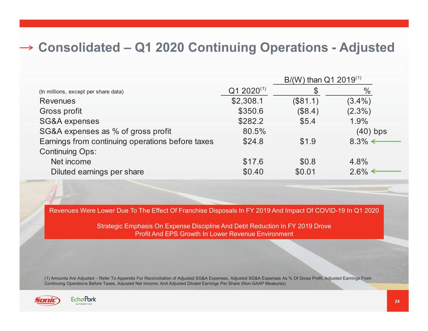 Consolidated – Q1 2020 Continuing Operations – GAAP B/(W) than Q1 2019 (In millions, except per share data) Q1 2020 $ % Revenues $2,308.1 ($81.1) (3.4%) Gross profit $350.6 ($8.4) (2.3%) SG&A expenses $282.2 ($35.1) (14.2%) SG&A expenses as % of gross profit 80.5% (1,170) bps Earnings from continuing operations before taxes ($243.2) ($304.6) (496.6%) Continuing Ops: Net income ($199.1) ($241.5) (570.2%) Diluted earnings per share ($4.67) ($5.66) (571.7%) In Q1 2020 Sonic Was Required To Record A Non-Cash Goodwill Impairment Charge Of $268.0 Million Related To Its Franchised Dealerships Reporting Unit As A Result Of A Decrease In The Company’s Market Value Due To The COVID-19 Pandemic’s Effect On The Stock Market And Expected Reduction In Economic Activity In The Near Term Note: Refer To Appendix For Items Of Interest That May Affect Comparability Of GAAP Amounts 23