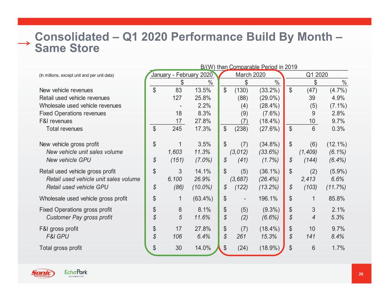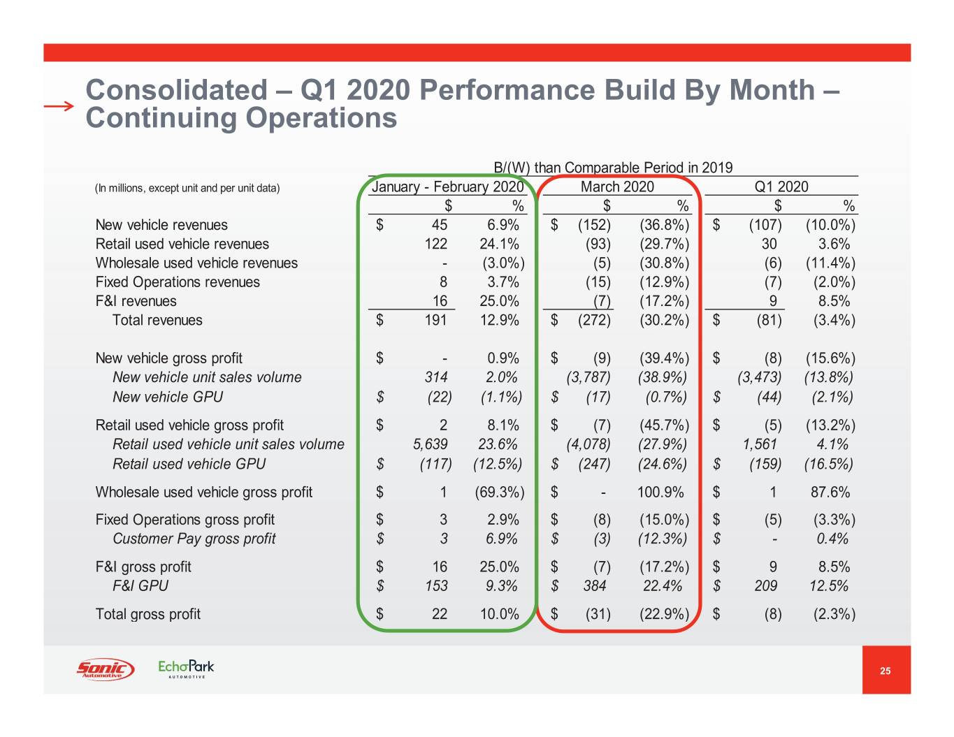 Consolidated – Q1 2020 Performance Build By Month – Continuing Operations B/(W) than Comparable Period in 2019 (In millions, except unit and per unit data) January - February 2020 March 2020 Q1 2020 $% $ % $% New vehicle revenues$ 45 6.9%$ (152) (36.8%)$ (107) (10.0%) Retail used vehicle revenues 122 24.1% (93) (29.7%) 30 3.6% Wholesale used vehicle revenues - (3.0%) (5) (30.8%) (6) (11.4%) Fixed Operations revenues 8 3.7% (15) (12.9%) (7) (2.0%) F&I revenues 16 25.0% (7) (17.2%) 9 8.5% Total revenues$ 191 12.9%$ (272) (30.2%)$ (81) (3.4%) New vehicle gross profit$ - 0.9%$ (9) (39.4%)$ (8) (15.6%) New vehicle unit sales volume 314 2.0% (3,787) (38.9%) (3,473) (13.8%) New vehicle GPU$ (22) (1.1%)$ (17) (0.7%)$ (44) (2.1%) Retail used vehicle gross profit$ 2 8.1%$ (7) (45.7%)$ (5) (13.2%) Retail used vehicle unit sales volume 5,639 23.6% (4,078) (27.9%) 1,561 4.1% Retail used vehicle GPU$ (117) (12.5%)$ (247) (24.6%)$ (159) (16.5%) Wholesale used vehicle gross profit$ 1 (69.3%)$ - 100.9%$ 1 87.6% Fixed Operations gross profit$ 3 2.9%$ (8) (15.0%)$ (5) (3.3%) Customer Pay gross profit$ 3 6.9%$ (3) (12.3%)$ - 0.4% F&I gross profit$ 16 25.0%$ (7) (17.2%)$ 9 8.5% F&I GPU$ 153 9.3%$ 384 22.4%$ 209 12.5% Total gross profit$ 22 10.0%$ ( 31) (22.9%)($ 8) (2.3%) 25