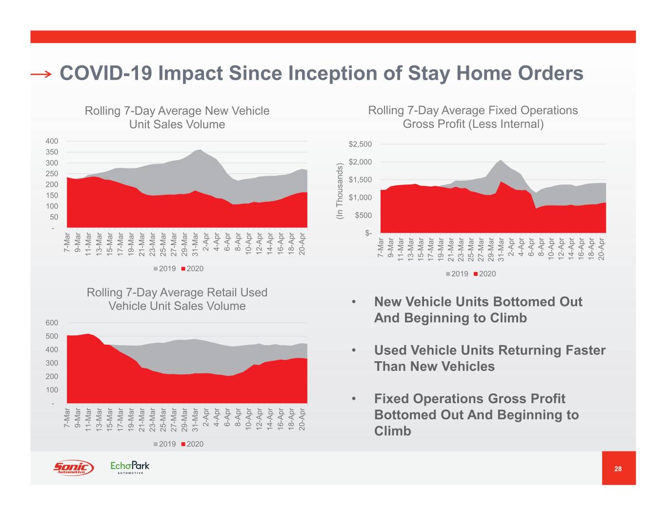 COVID-19 Impact Since Inception of Stay Home Orders Rolling 7-Day Average New Vehicle Rolling 7-Day Average Fixed Operations Unit Sales Volume Gross Profit (Less Internal) 400 $2,500 350 300 $2,000 250 $1,500 200 150 $1,000 100 $500 50 (In Thousands) - $- 2-Apr 4-Apr 6-Apr 8-Apr 7-Mar 9-Mar 10-Apr 12-Apr 14-Apr 16-Apr 18-Apr 20-Apr 2-Apr 4-Apr 6-Apr 8-Apr 11-Mar 13-Mar 15-Mar 17-Mar 19-Mar 21-Mar 23-Mar 25-Mar 27-Mar 29-Mar 31-Mar 7-Mar 9-Mar 10-Apr 12-Apr 14-Apr 16-Apr 18-Apr 20-Apr 11-Mar 13-Mar 15-Mar 17-Mar 19-Mar 21-Mar 23-Mar 25-Mar 27-Mar 29-Mar 31-Mar 2019 2020 2019 2020 Rolling 7-Day Average Retail Used Vehicle Unit Sales Volume New Vehicle Units Bottomed Out 600 And Beginning to Climb 500 400 Used Vehicle Units Returning Faster 300 Than New Vehicles 200 100 - Fixed Operations Gross Profit Bottomed Out And Beginning to 2-Apr 4-Apr 6-Apr 8-Apr 7-Mar 9-Mar 10-Apr 12-Apr 14-Apr 16-Apr 18-Apr 20-Apr 11-Mar 13-Mar 15-Mar 17-Mar 19-Mar 21-Mar 23-Mar 25-Mar 27-Mar 29-Mar 31-Mar Climb 2019 2020 28