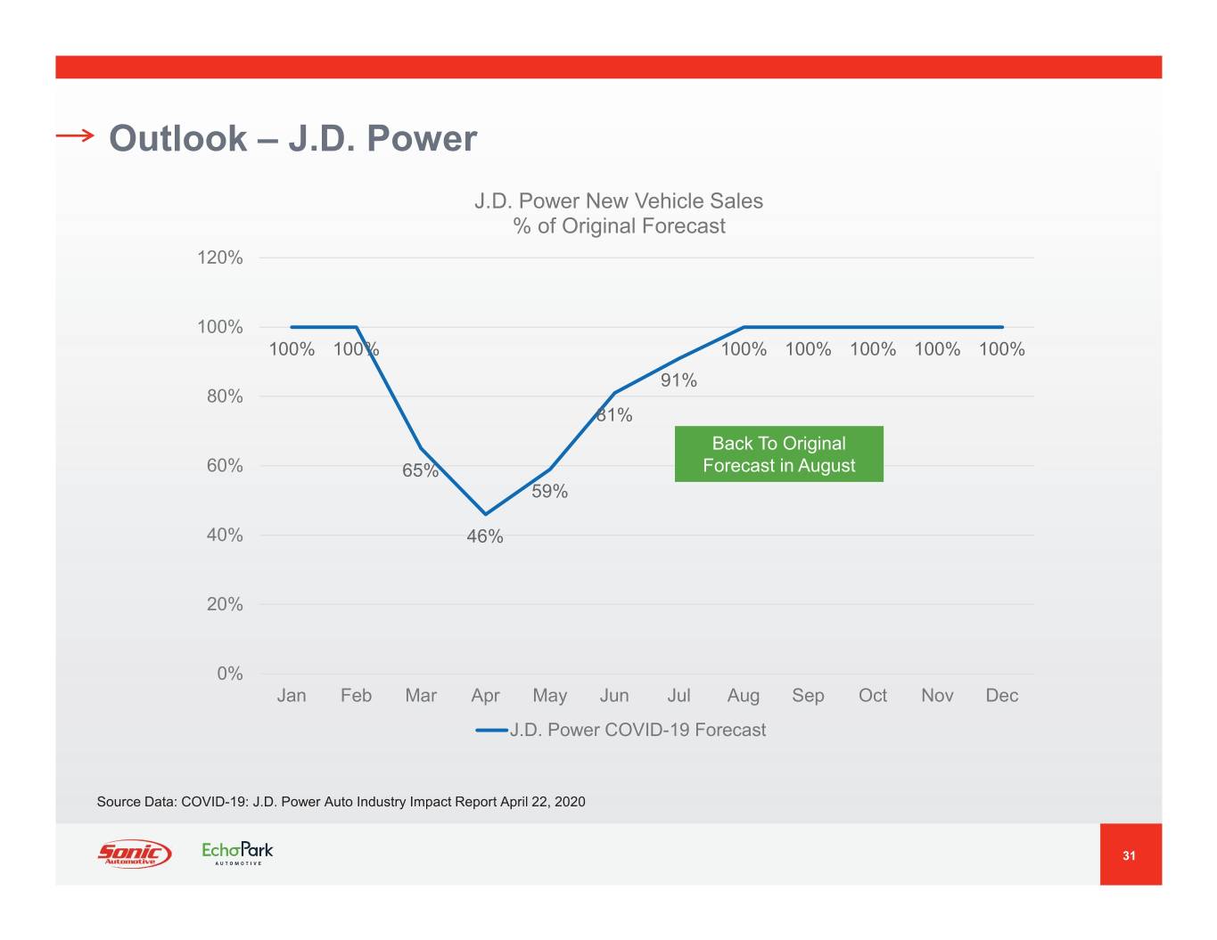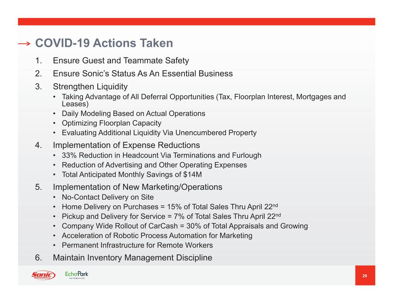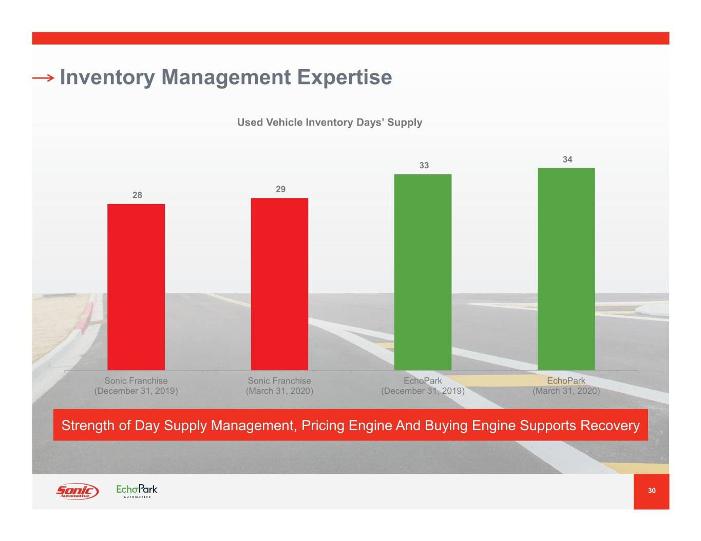 COVID-19 Actions Taken 1. Ensure Guest and Teammate Safety 2. Ensure Sonic’s Status As An Essential Business 3. Strengthen Liquidity Taking Advantage of All Deferral Opportunities (Tax, Floorplan Interest, Mortgages and Leases) Daily Modeling Based on Actual Operations Optimizing Floorplan Capacity Evaluating Additional Liquidity Via Unencumbered Property 4. Implementation of Expense Reductions 33% Reduction in Headcount Via Terminations and Furlough Reduction of Advertising and Other Operating Expenses Total Anticipated Monthly Savings of $14M 5. Implementation of New Marketing/Operations No-Contact Delivery on Site Home Delivery on Purchases = 15% of Total Sales Thru April 22nd Pickup and Delivery for Service = 7% of Total Sales Thru April 22nd Company Wide Rollout of CarCash = 30% of Total Appraisals and Growing Acceleration of Robotic Process Automation for Marketing Permanent Infrastructure for Remote Workers 6. Maintain Inventory Management Discipline 29