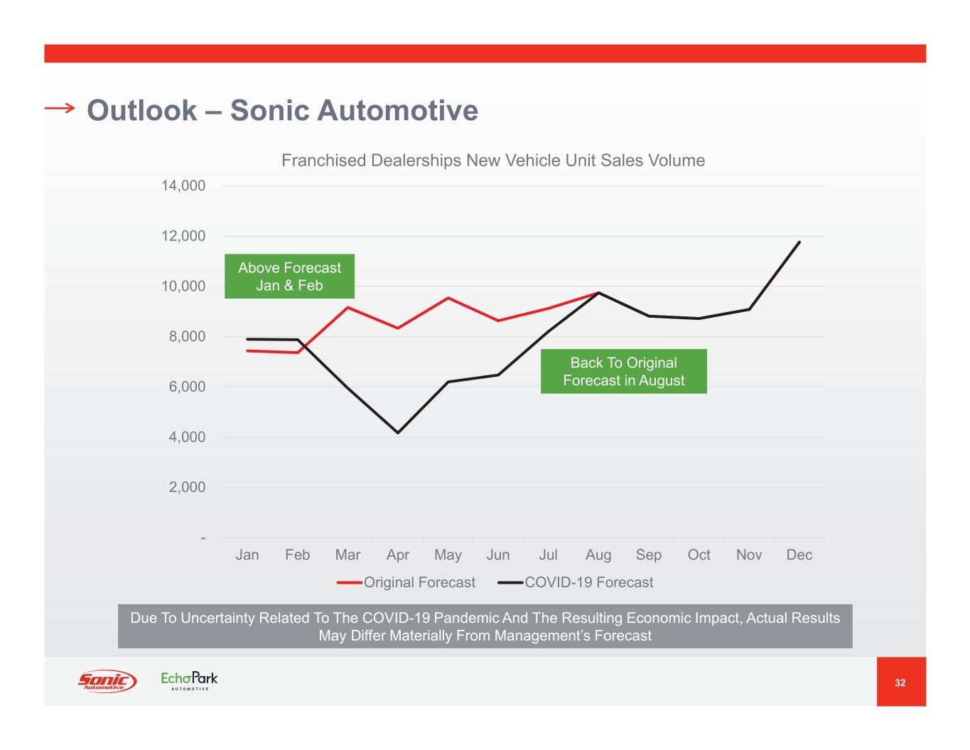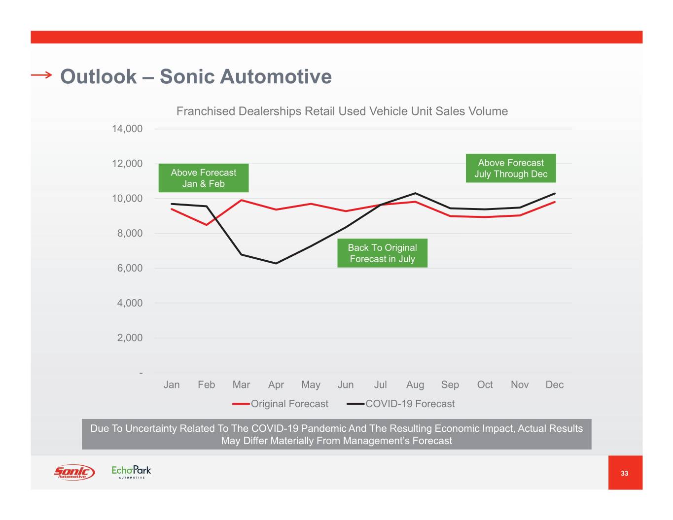 Outlook – Sonic Automotive Franchised Dealerships New Vehicle Unit Sales Volume 14,000 12,000 Above Forecast 10,000 Jan & Feb 8,000 Back To Original 6,000 Forecast in August 4,000 2,000 - Jan Feb Mar Apr May Jun Jul Aug Sep Oct Nov Dec Original Forecast COVID-19 Forecast Due To Uncertainty Related To The COVID-19 Pandemic And The Resulting Economic Impact, Actual Results May Differ Materially From Management’s Forecast 32