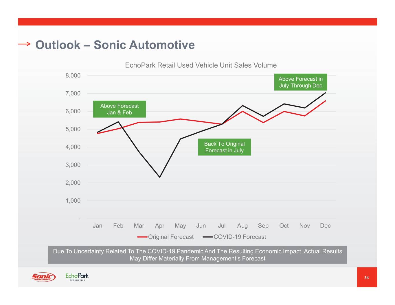 Outlook – Sonic Automotive Franchised Dealerships Retail Used Vehicle Unit Sales Volume 14,000 12,000 Above Forecast Above Forecast July Through Dec Jan & Feb 10,000 8,000 Back To Original Forecast in July 6,000 4,000 2,000 - Jan Feb Mar Apr May Jun Jul Aug Sep Oct Nov Dec Original Forecast COVID-19 Forecast Due To Uncertainty Related To The COVID-19 Pandemic And The Resulting Economic Impact, Actual Results May Differ Materially From Management’s Forecast 33