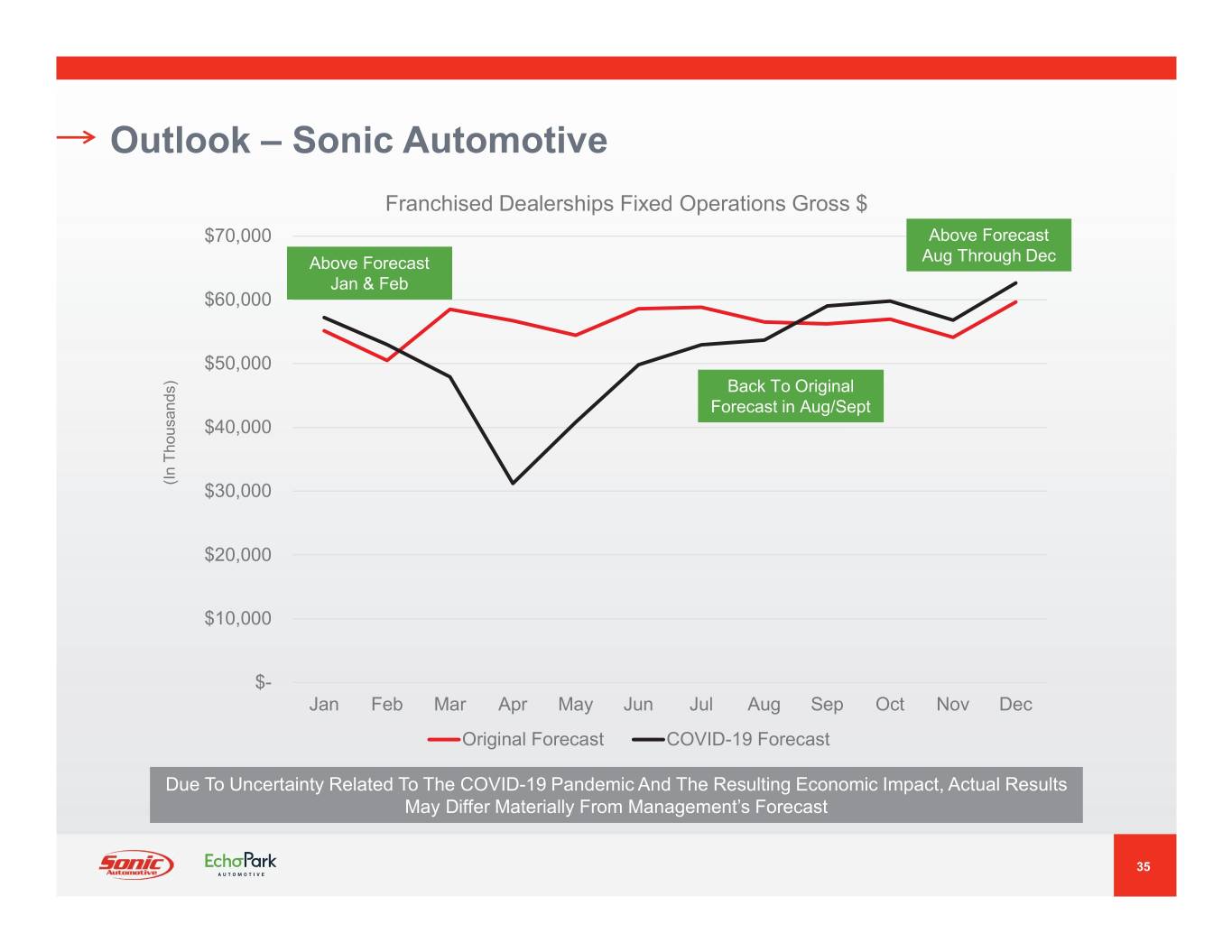 Outlook – Sonic Automotive EchoPark Retail Used Vehicle Unit Sales Volume 8,000 Above Forecast in July Through Dec 7,000 Above Forecast 6,000 Jan & Feb 5,000 Back To Original 4,000 Forecast in July 3,000 2,000 1,000 - Jan Feb Mar Apr May Jun Jul Aug Sep Oct Nov Dec Original Forecast COVID-19 Forecast Due To Uncertainty Related To The COVID-19 Pandemic And The Resulting Economic Impact, Actual Results May Differ Materially From Management’s Forecast 34