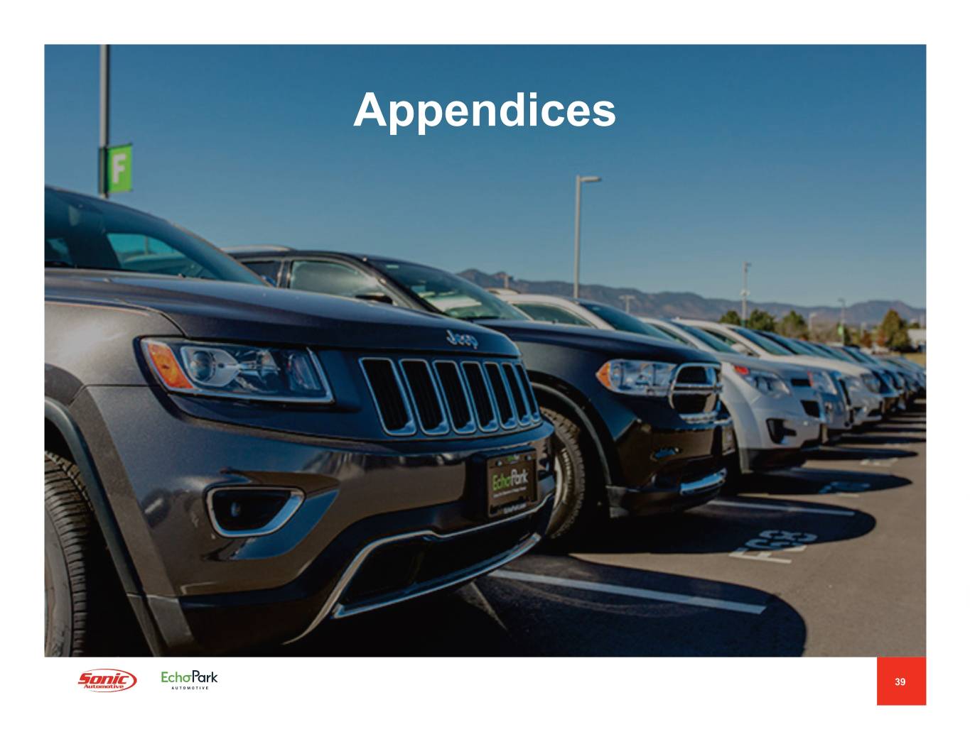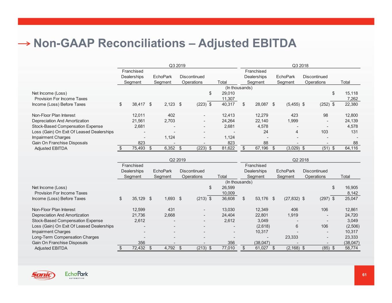 Non-GAAP Reconciliations – Adjusted EBITDA Q3 2019 Q3 2018 Franchised Franchised Dealerships EchoPark Discontinued Dealerships EchoPark Discontinued Segment Segment Operations Total Segment Segment Operations Total (In thousands) Net Income (Loss) $ 29,010 $ 15,118 Provision For Income Taxes 11,307 7,262 Income (Loss) Before Taxes $ 38,417 $ 2,123 $ (223) $ 40,317 $ 28,087 $ (5,455) $ (252) $ 22,380 Non-Floor Plan Interest 12,011 402 - 12,413 12,279 423 98 12,800 Depreciation And Amortization 21,561 2,703 - 24,264 22,140 1,999 - 24,139 Stock-Based Compensation Expense 2,681 - - 2,681 4,578 - - 4,578 Loss (Gain) On Exit Of Leased Dealerships - - - - 24 4 103 131 Impairment Charges - 1,124 - 1,124 - - - - Gain On Franchise Disposals 823 - - 823 88 - - 88 Adjusted EBITDA $ 75,493 $ 6,352 $ (223) $ 81,622 $ 67,196 $ (3,029) $ (51) $ 64,116 Q2 2019 Q2 2018 Franchised Franchised Dealerships EchoPark Discontinued Dealerships EchoPark Discontinued Segment Segment Operations Total Segment Segment Operations Total (In thousands) Net Income (Loss) $ 26,599 $ 16,905 Provision For Income Taxes 10,009 8,142 Income (Loss) Before Taxes $ 35,129 $ 1,693 $ (213) $ 36,608 $ 53,176 $ (27,832) $ (297) $ 25,047 Non-Floor Plan Interest 12,599 431 - 13,030 12,349 406 106 12,861 Depreciation And Amortization 21,736 2,668 - 24,404 22,801 1,919 - 24,720 Stock-Based Compensation Expense 2,612 - - 2,612 3,049 - - 3,049 Loss (Gain) On Exit Of Leased Dealerships - - - - (2,618) 6 106 (2,506) Impairment Charges - - - - 10,317 - - 10,317 Long-Term Compensation Charges - - - - - 23,333 - 23,333 Gain On Franchise Disposals 356 - - 356 (38,047) - - (38,047) Adjusted EBITDA $ 72,432 $ 4,792 $ (213) $ 77,010 $ 61,027 $ (2,168) $ (85) $ 58,774 61