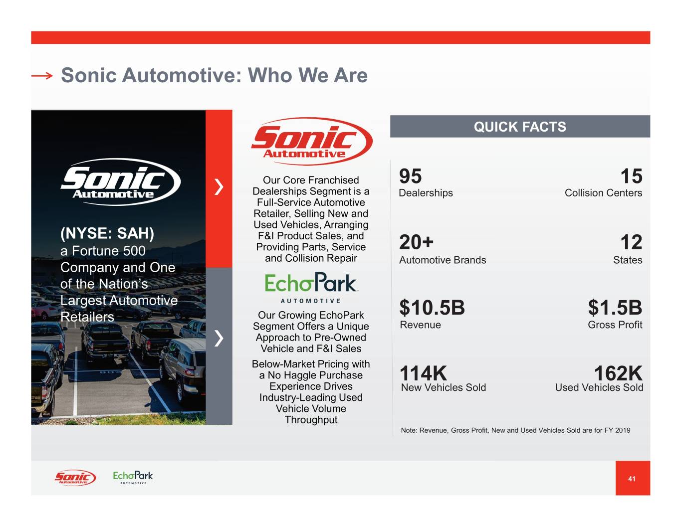 Sonic Automotive: Who We Are QUICK FACTS Our Core Franchised 95 15 Dealerships Segment is a Dealerships Collision Centers Full-Service Automotive Retailer, Selling New and Used Vehicles, Arranging (NYSE: SAH) F&I Product Sales, and a Fortune 500 Providing Parts, Service 20+ 12 and Collision Repair Automotive Brands States Company and One of the Nation’s Largest Automotive Retailers Our Growing EchoPark $10.5B $1.5B Segment Offers a Unique Revenue Gross Profit Approach to Pre-Owned Vehicle and F&I Sales Below-Market Pricing with a No Haggle Purchase 114K 162K Experience Drives New Vehicles Sold Used Vehicles Sold Industry-Leading Used Vehicle Volume Throughput Note: Revenue, Gross Profit, New and Used Vehicles Sold are for FY 2019 41