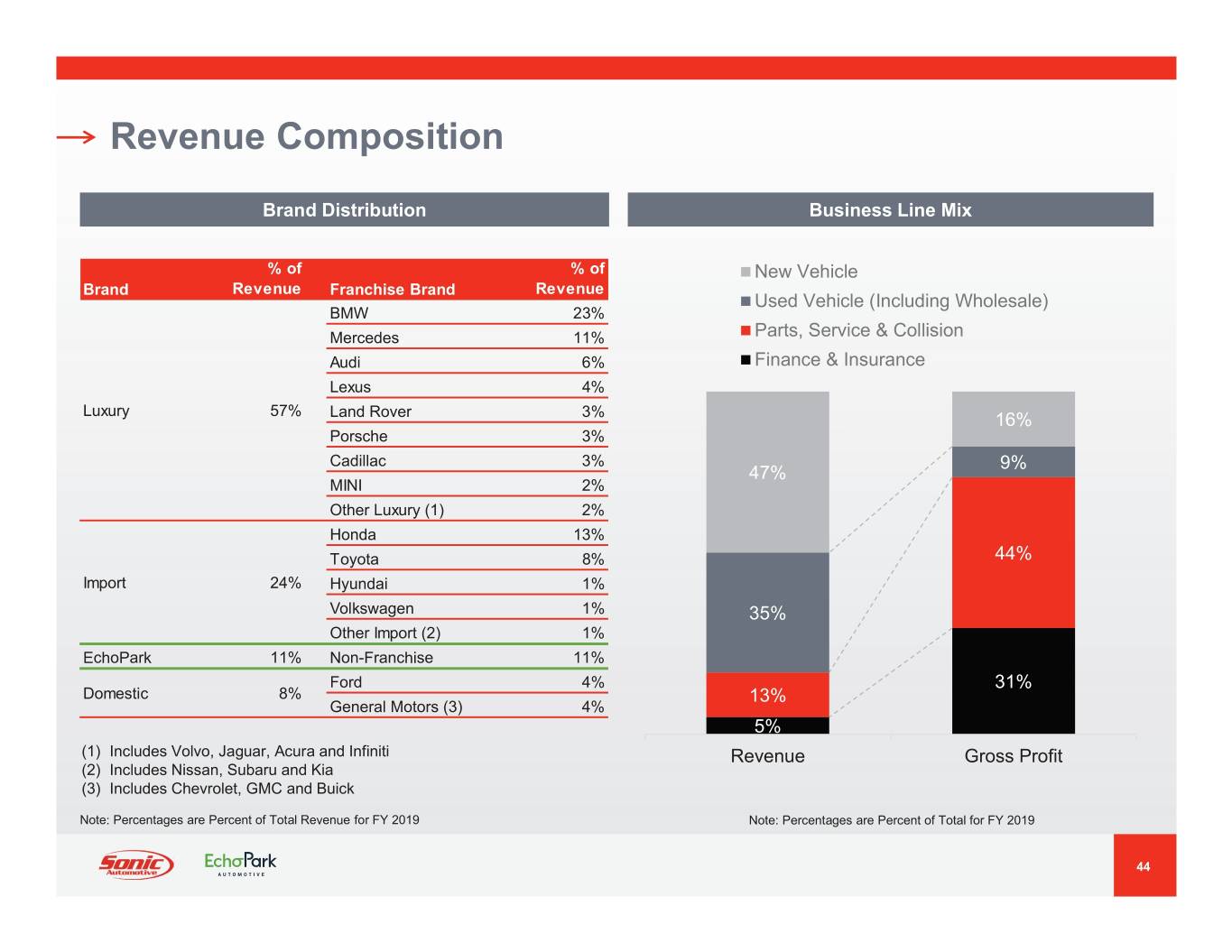 Revenue Composition BY GEOGRAPHY Geographic Footprint, Revenue Streams and Brand Mix Offer Attractive Diversification Across the Automotive Retail Space SC 2% NV 2% Other * 3% MD 2% VA 2% GA 3% NC 4% CA 28% AL 5% Concentration in Major Metro FL 6% Markets TN 7% CO 9% TX 27% Note: Percentages are Percent of Total Revenue for FY 2019 * Consists of Disposed Stores and Holding Companies 43