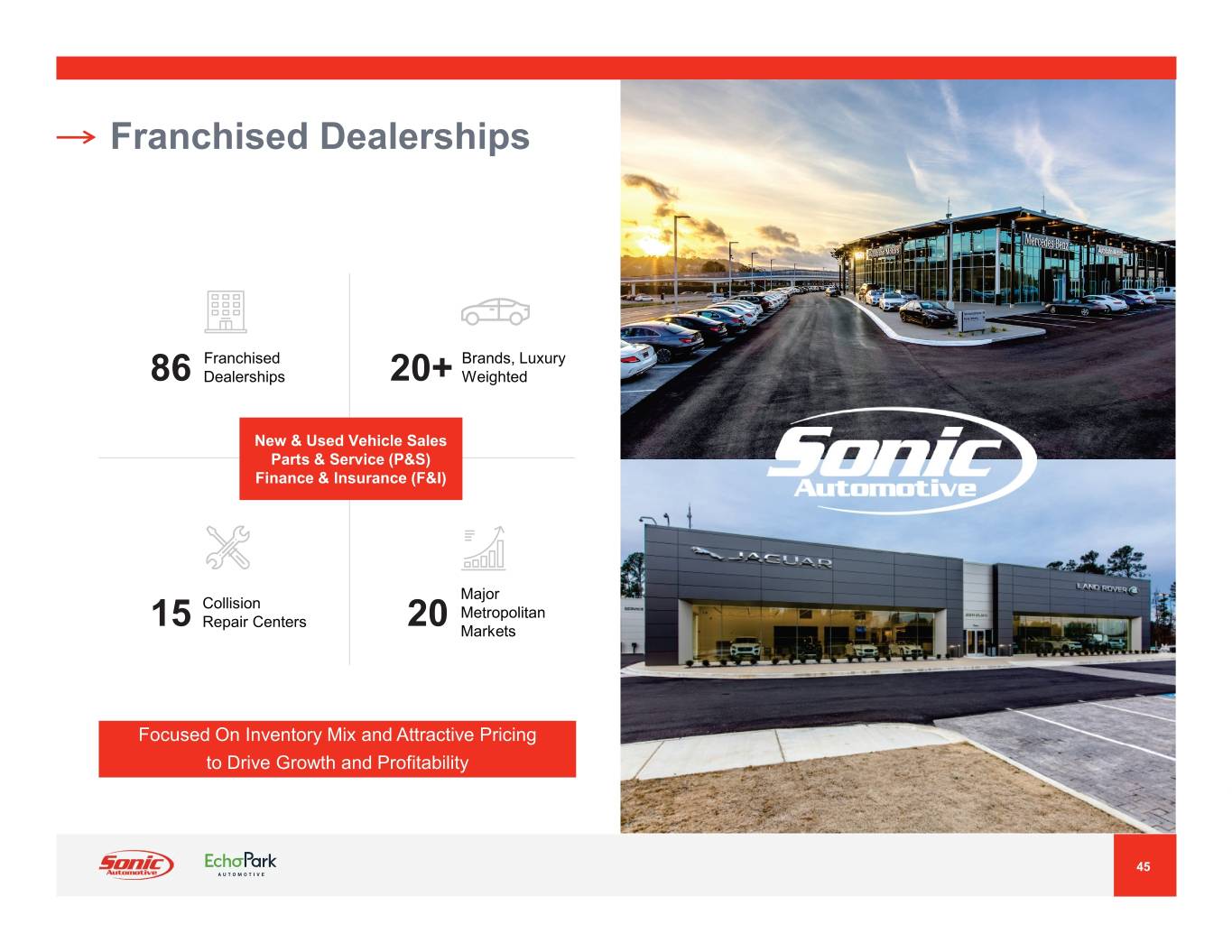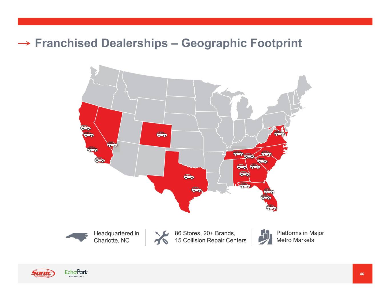 Franchised Dealerships Franchised Brands, Luxury 86 Dealerships 20+ Weighted New & Used Vehicle Sales Parts & Service (P&S) Finance & Insurance (F&I) Major Collision Metropolitan Repair Centers 15 20 Markets Focused On Inventory Mix and Attractive Pricing to Drive Growth and Profitability 45