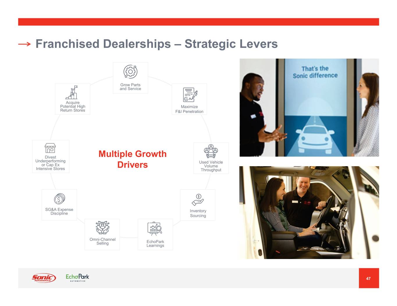 Franchised Dealerships – Strategic Levers Grow Parts and Service Acquire Potential High Maximize Return Stores F&I Penetration Divest Multiple Growth Underperforming Used Vehicle or Cap Ex Drivers Volume Intensive Stores Throughput SG&A Expense Inventory Discipline Sourcing Omni-Channel Selling EchoPark Learnings 47