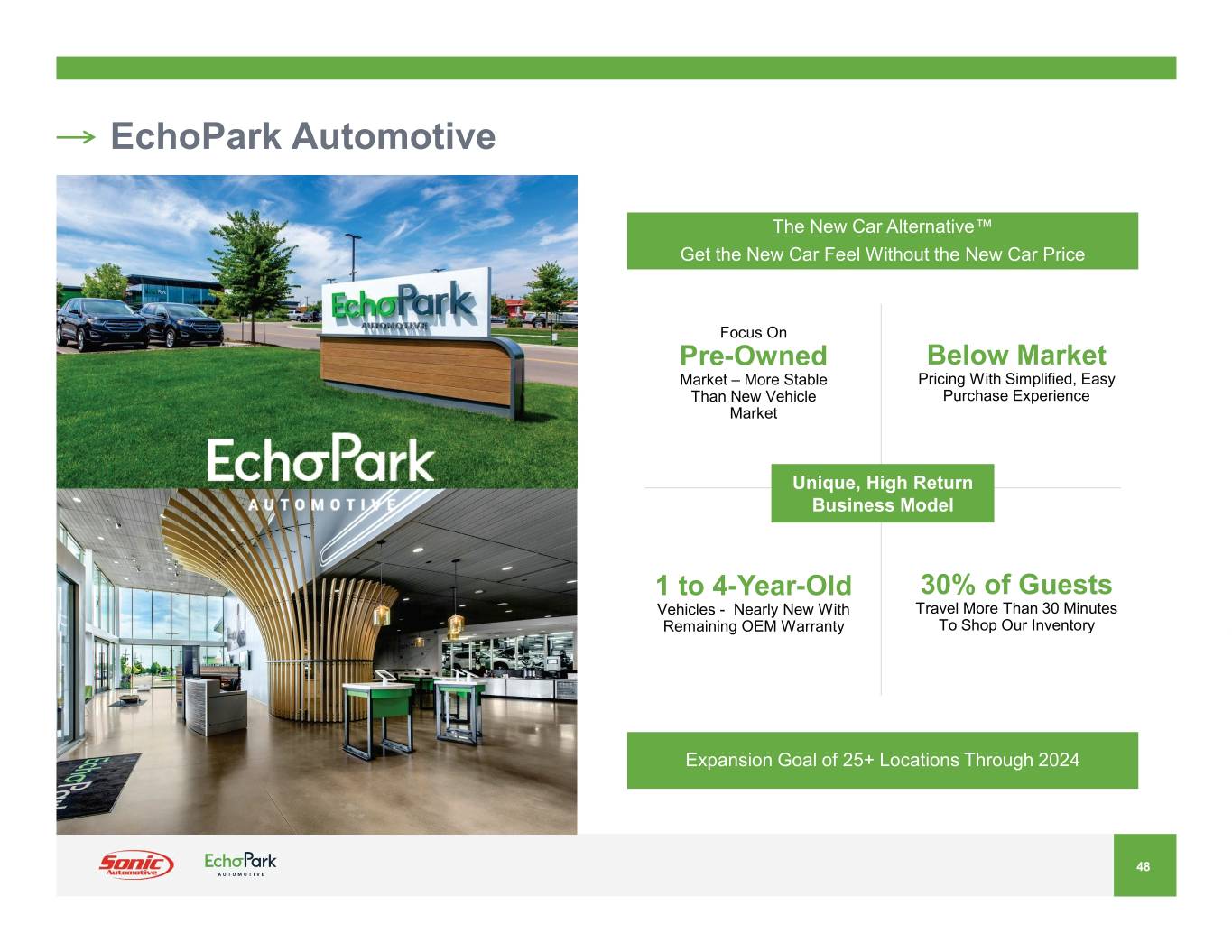 EchoPark Automotive The New Car Alternative™ Get the New Car Feel Without the New Car Price Focus On Pre-Owned Below Market Market – More Stable Pricing With Simplified, Easy Than New Vehicle Purchase Experience Market Unique, High Return Business Model 1 to 4-Year-Old 30% of Guests Vehicles - Nearly New With Travel More Than 30 Minutes Remaining OEM Warranty To Shop Our Inventory Expansion Goal of 25+ Locations Through 2024 48