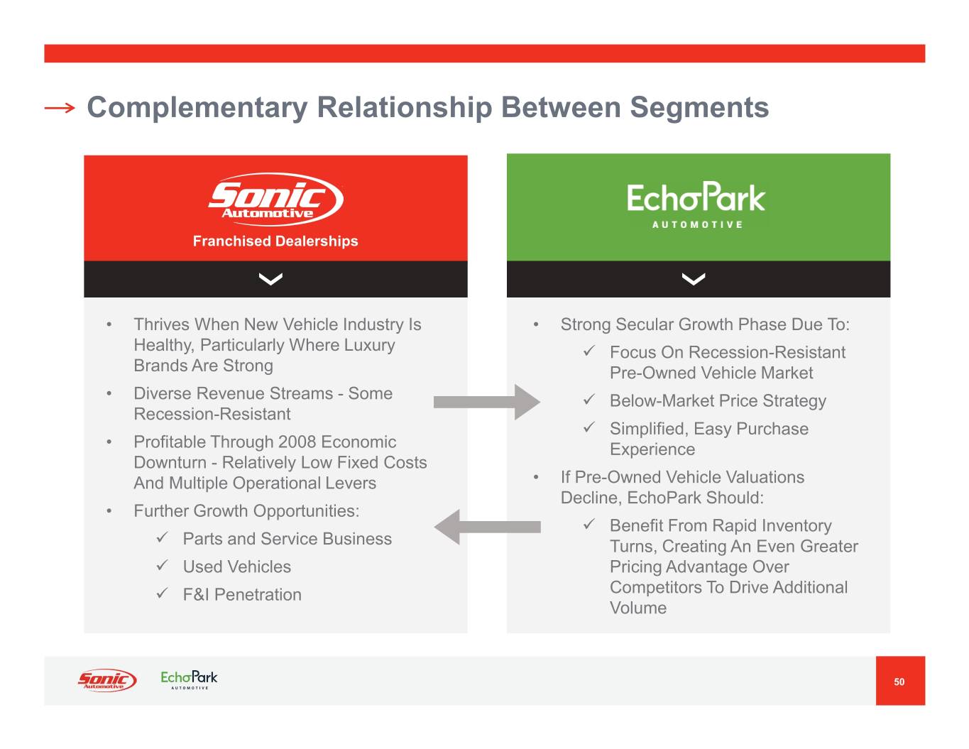 Complementary Relationship Between Segments Franchised Dealerships Thrives When New Vehicle Industry Is Strong Secular Growth Phase Due To: Healthy, Particularly Where Luxury 9 Focus On Recession-Resistant Brands Are Strong Pre-Owned Vehicle Market Diverse Revenue Streams - Some 9 Below-Market Price Strategy Recession-Resistant 9 Simplified, Easy Purchase Profitable Through 2008 Economic Experience Downturn - Relatively Low Fixed Costs And Multiple Operational Levers If Pre-Owned Vehicle Valuations Decline, EchoPark Should: Further Growth Opportunities: 9 Benefit From Rapid Inventory 9 Parts and Service Business Turns, Creating An Even Greater 9 Used Vehicles Pricing Advantage Over 9 F&I Penetration Competitors To Drive Additional Volume 50
