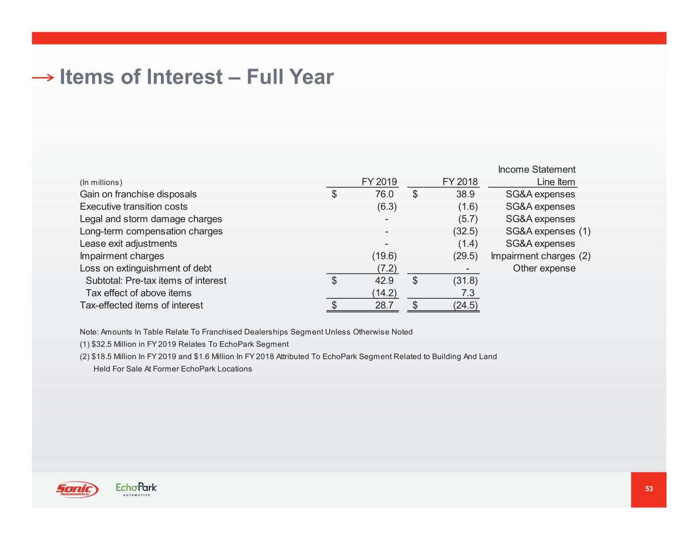 Items of Interest – Full Year Income Statement (In millions) FY 2019 FY 2018 Line Item Gain on franchise disposals$ 76.0 $ 38.9 SG&A expenses Executive transition costs (6.3) (1.6) SG&A expenses Legal and storm damage charges - (5.7) SG&A expenses Long-term compensation charges - (32.5) SG&A expenses (1) Lease exit adjustments - (1.4) SG&A expenses Impairment charges (19.6) (29.5) Impairment charges (2) Loss on extinguishment of debt (7.2) - Other expense Subtotal: Pre-tax items of interest$ 42.9 $ (31.8) Tax effect of above items (14.2) 7.3 Tax-effected items of interest$ 28.7 $ (24.5) Note: Amounts In Table Relate To Franchised Dealerships Segment Unless Otherwise Noted (1) $32.5 Million in FY 2019 Relates To EchoPark Segment (2) $18.5 Million In FY 2019 and $1.6 Million In FY 2018 Attributed To EchoPark Segment Related to Building And Land Held For Sale At Former EchoPark Locations 53