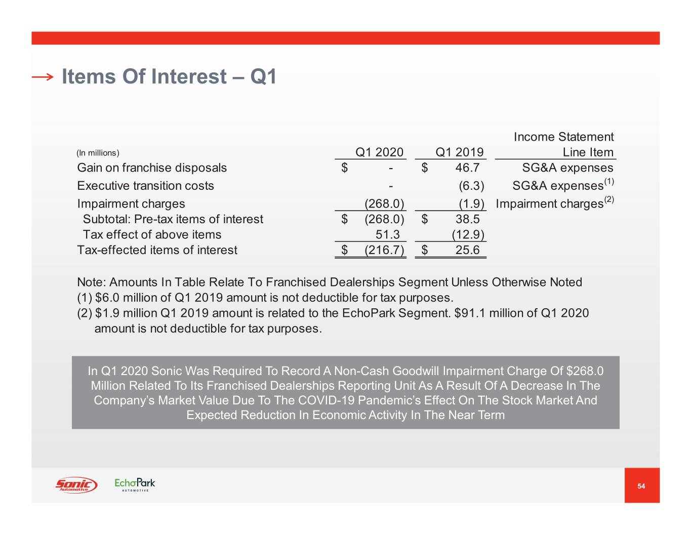 Items Of Interest – Q1 Income Statement (In millions) Q1 2020 Q1 2019 Line Item Gain on franchise disposals$ - $ 46.7 SG&A expenses Executive transition costs - (6.3) SG&A expenses (1) Impairment charges (268.0) (1.9) Impairment charges (2) Subtotal: Pre-tax items of interest$ (268.0) $ 38.5 Tax effect of above items 51.3 (12.9) Tax-effected items of interest$ (216.7) $ 25.6 Note: Amounts In Table Relate To Franchised Dealerships Segment Unless Otherwise Noted (1) $6.0 million of Q1 2019 amount is not deductible for tax purposes. (2) $1.9 million Q1 2019 amount is related to the EchoPark Segment. $91.1 million of Q1 2020 amount is not deductible for tax purposes. In Q1 2020 Sonic Was Required To Record A Non-Cash Goodwill Impairment Charge Of $268.0 Million Related To Its Franchised Dealerships Reporting Unit As A Result Of A Decrease In The Company’s Market Value Due To The COVID-19 Pandemic’s Effect On The Stock Market And Expected Reduction In Economic Activity In The Near Term 54