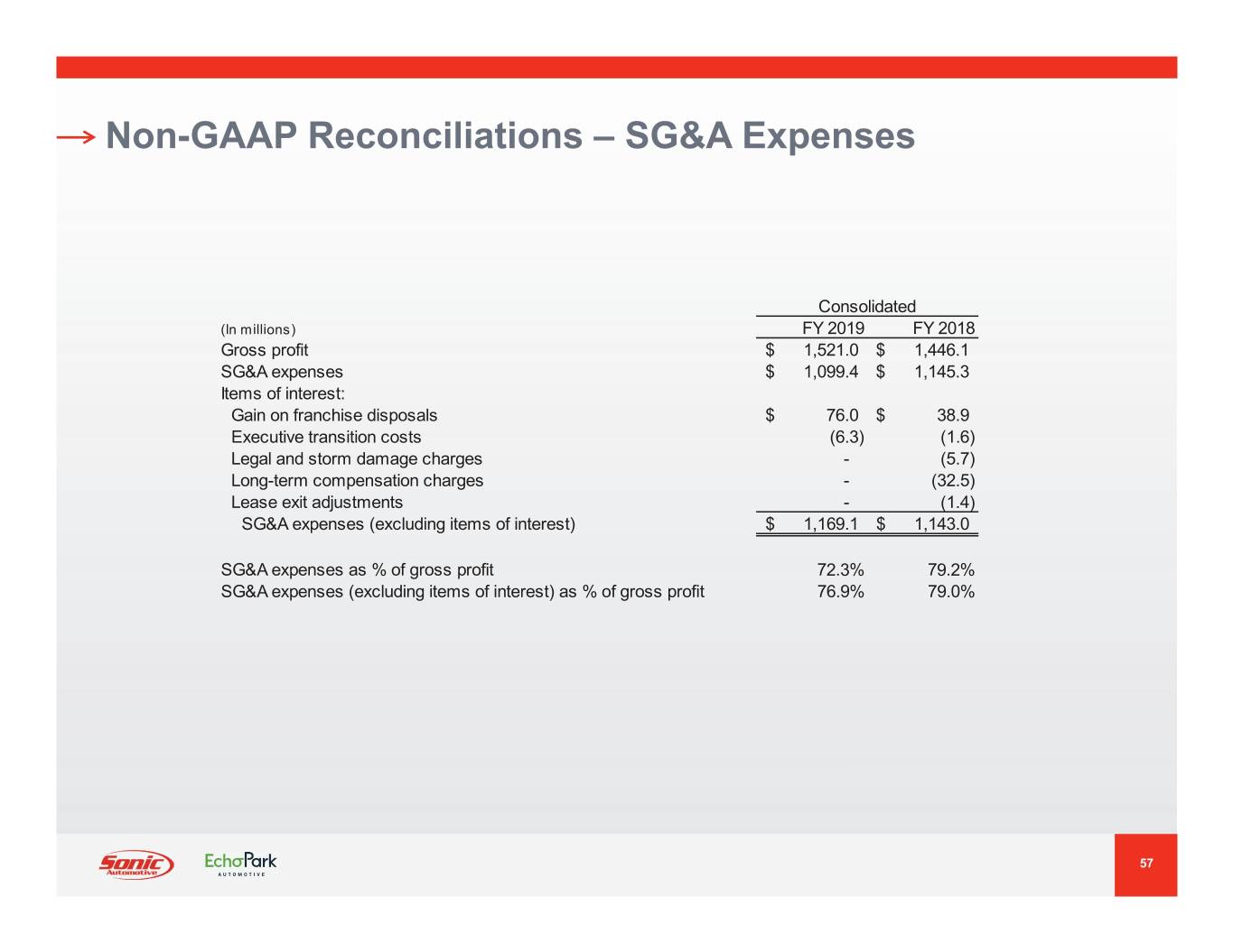Non-GAAP Reconciliations – SG&A Expenses Consolidated (In millions) FY 2019 FY 2018 Gross profit$ 1,521.0 $ 1,446.1 SG&A expenses$ 1,099.4 $ 1,145.3 Items of interest: Gain on franchise disposals$ 76.0 $ 38.9 Executive transition costs (6.3) (1.6) Legal and storm damage charges - (5.7) Long-term compensation charges - (32.5) Lease exit adjustments - (1.4) SG&A expenses (excluding items of interest)$ 1,169.1 $ 1,143.0 SG&A expenses as % of gross profit 72.3% 79.2% SG&A expenses (excluding items of interest) as % of gross profit 76.9% 79.0% 57