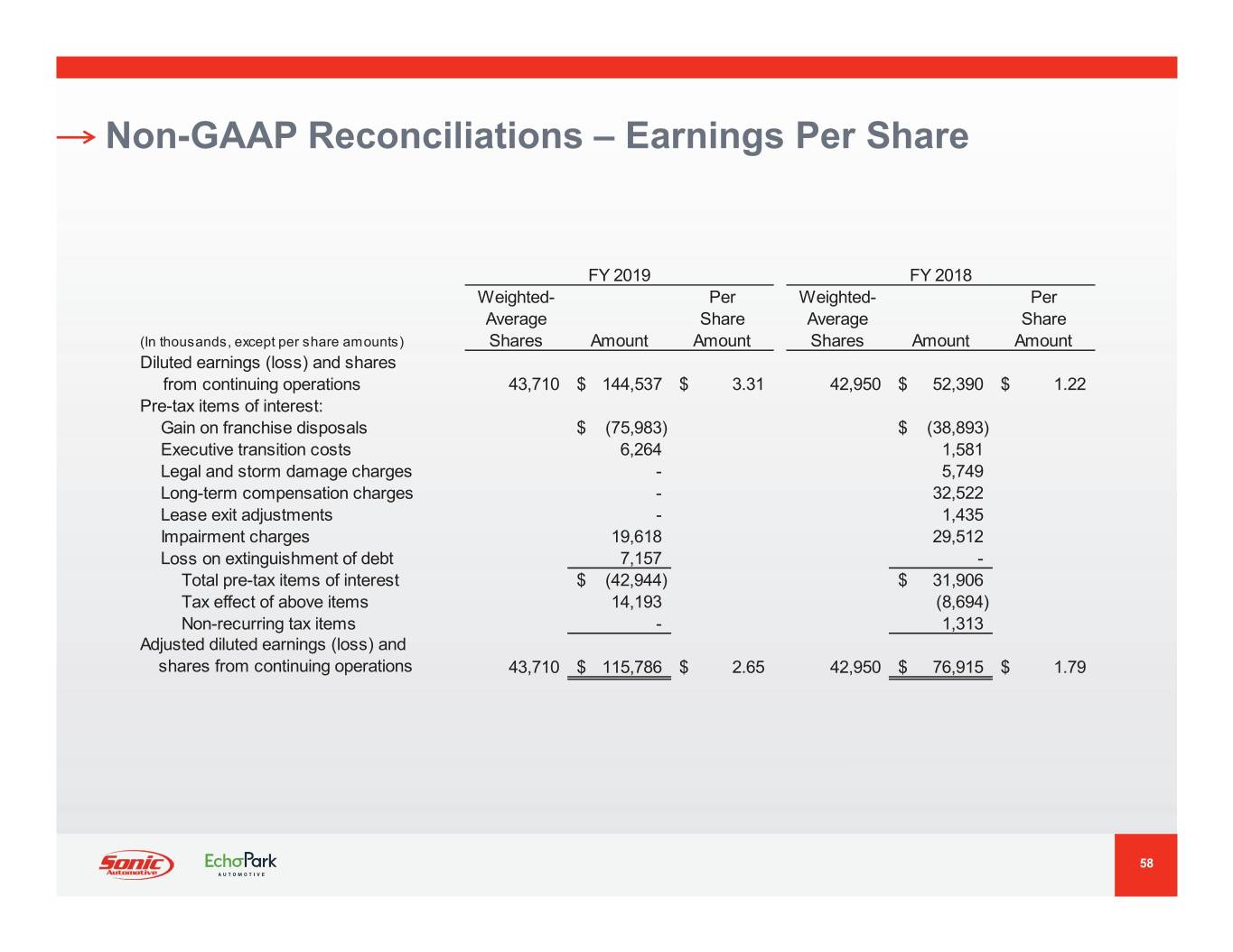 Non-GAAP Reconciliations – Earnings Per Share FY 2019 FY 2018 Weighted- Per Weighted- Per Average Share Average Share (In thousands, except per share amounts) Shares Amount Amount Shares Amount Amount Diluted earnings (loss) and shares from continuing operations 43,710 $ 144,537 $ 3.31 42,950 $ 52,390 $ 1.22 Pre-tax items of interest: Gain on franchise disposals$ (75,983) $ (38,893) Executive transition costs 6,264 1,581 Legal and storm damage charges - 5,749 Long-term compensation charges - 32,522 Lease exit adjustments - 1,435 Impairment charges 19,618 29,512 Loss on extinguishment of debt 7,157 - Total pre-tax items of interest$ (42,944) $ 31,906 Tax effect of above items 14,193 (8,694) Non-recurring tax items - 1,313 Adjusted diluted earnings (loss) and shares from continuing operations 43,710 $ 115,786 $ 2.65 42,950 $ 76,915 $ 1.79 58