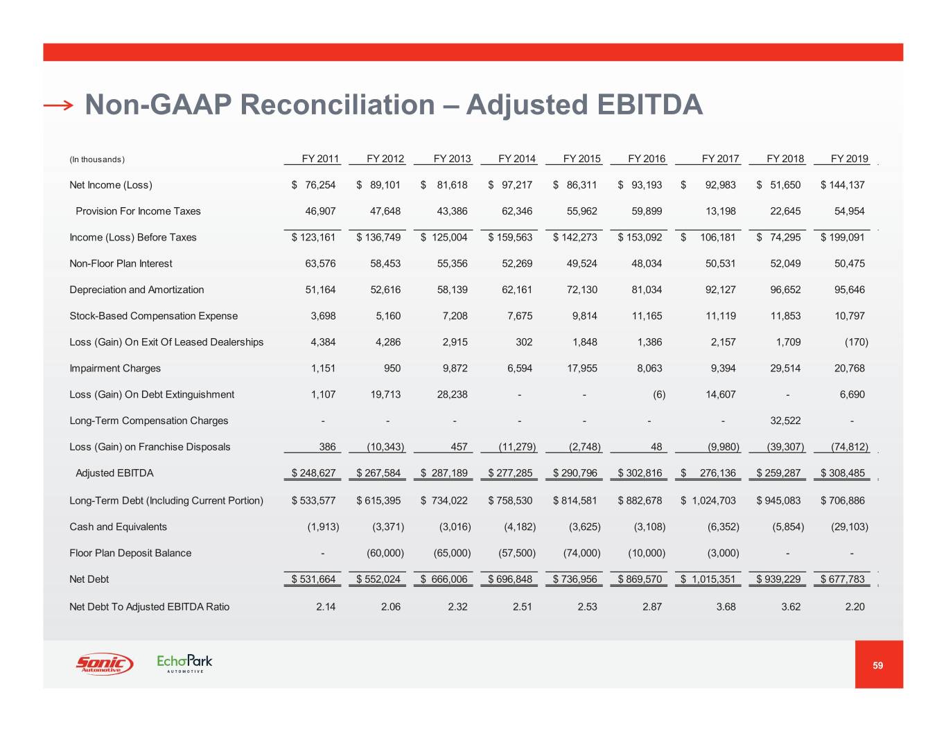 Non-GAAP Reconciliation – Adjusted EBITDA (In thousands) FY 2011 FY 2012 FY 2013 FY 2014 FY 2015 FY 2016 FY 2017 FY 2018 FY 2019 Net Income (Loss)$ 76,254 $ 89,101 $ 81,618 $ 97,217 $ 86,311 $ 93,193 $ 92,983 $ 51,650 $ 144,137 Provision For Income Taxes 46,907 47,648 43,386 62,346 55,962 59,899 13,198 22,645 54,954 Income (Loss) Before Taxes$ 123,161 $ 136,749 $ 125,004 $ 159,563 $ 142,273 $ 153,092 $ 106,181 $ 74,295 $ 199,091 Non-Floor Plan Interest 63,576 58,453 55,356 52,269 49,524 48,034 50,531 52,049 50,475 Depreciation and Amortization 51,164 52,616 58,139 62,161 72,130 81,034 92,127 96,652 95,646 Stock-Based Compensation Expense 3,698 5,160 7,208 7,675 9,814 11,165 11,119 11,853 10,797 Loss (Gain) On Exit Of Leased Dealerships 4,384 4,286 2,915 302 1,848 1,386 2,157 1,709 (170) Impairment Charges 1,151 950 9,872 6,594 17,955 8,063 9,394 29,514 20,768 Loss (Gain) On Debt Extinguishment 1,107 19,713 28,238 - - (6) 14,607 - 6,690 Long-Term Compensation Charges - - - - - - - 32,522 - Loss (Gain) on Franchise Disposals 386 (10,343) 457 (11,279) (2,748) 48 (9,980) (39,307) (74,812) Adjusted EBITDA$ 248,627 $ 267,584 $ 287,189 $ 277,285 $ 290,796 $ 302,816 $ 276,136 $ 259,287 $ 308,485 Long-Term Debt (Including Current Portion)$ 533,577 $ 615,395 $ 734,022 $ 758,530 $ 814,581 $ 882,678 $ 1,024,703 $ 945,083 $ 706,886 Cash and Equivalents (1,913) (3,371) (3,016) (4,182) (3,625) (3,108) (6,352) (5,854) (29,103) Floor Plan Deposit Balance - (60,000) (65,000) (57,500) (74,000) (10,000) (3,000) - - Net Debt$ 531,664 $ 552,024 $ 666,006 $ 696,848 $ 736,956 $ 869,570 $ 1,015,351 $ 939,229 $ 677,783 Net Debt To Adjusted EBITDA Ratio 2.14 2.06 2.32 2.51 2.53 2.87 3.68 3.62 2.20 59