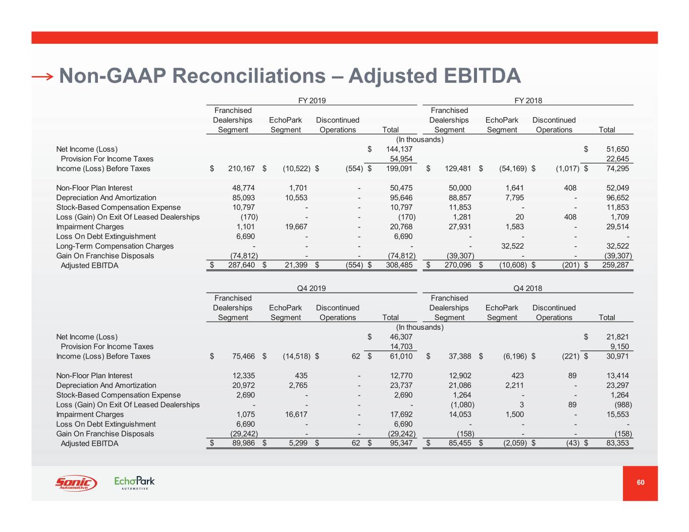 Non-GAAP Reconciliations – Adjusted EBITDA FY 2019 FY 2018 Franchised Franchised Dealerships EchoPark Discontinued Dealerships EchoPark Discontinued Segment Segment Operations Total Segment Segment Operations Total (In thousands) Net Income (Loss) $ 144,137 $ 51,650 Provision For Income Taxes 54,954 22,645 Income (Loss) Before Taxes $ 210,167 $ (10,522) $ (554) $ 199,091 $ 129,481 $ (54,169) $ (1,017) $ 74,295 Non-Floor Plan Interest 48,774 1,701 - 50,475 50,000 1,641 408 52,049 Depreciation And Amortization 85,093 10,553 - 95,646 88,857 7,795 - 96,652 Stock-Based Compensation Expense 10,797 - - 10,797 11,853 - - 11,853 Loss (Gain) On Exit Of Leased Dealerships (170) - - (170) 1,281 20 408 1,709 Impairment Charges 1,101 19,667 - 20,768 27,931 1,583 - 29,514 Loss On Debt Extinguishment 6,690 - - 6,690 - - - - Long-Term Compensation Charges - - - - - 32,522 - 32,522 Gain On Franchise Disposals (74,812) - - (74,812) (39,307) - - (39,307) Adjusted EBITDA $ 287,640 $ 21,399 $ (554) $ 308,485 $ 270,096 $ (10,608) $ (201) $ 259,287 Q4 2019 Q4 2018 Franchised Franchised Dealerships EchoPark Discontinued Dealerships EchoPark Discontinued Segment Segment Operations Total Segment Segment Operations Total (In thousands) Net Income (Loss) $ 46,307 $ 21,821 Provision For Income Taxes 14,703 9,150 Income (Loss) Before Taxes $ 75,466 $ (14,518) $ 62 $ 61,010 $ 37,388 $ (6,196) $ (221) $ 30,971 Non-Floor Plan Interest 12,335 435 - 12,770 12,902 423 89 13,414 Depreciation And Amortization 20,972 2,765 - 23,737 21,086 2,211 - 23,297 Stock-Based Compensation Expense 2,690 - - 2,690 1,264 - - 1,264 Loss (Gain) On Exit Of Leased Dealerships - - - - (1,080) 3 89 (988) Impairment Charges 1,075 16,617 - 17,692 14,053 1,500 - 15,553 Loss On Debt Extinguishment 6,690 - - 6,690 - - - - Gain On Franchise Disposals (29,242) - - (29,242) (158) - - (158) Adjusted EBITDA $ 89,986 $ 5,299 $ 62 $ 95,347 $ 85,455 $ (2,059) $ (43) $ 83,353 60