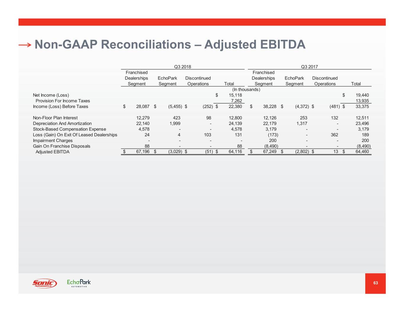 Non-GAAP Reconciliations – Adjusted EBITDA Q3 2018 Q3 2017 Franchised Franchised Dealerships EchoPark Discontinued Dealerships EchoPark Discontinued Segment Segment Operations Total Segment Segment Operations Total (In thousands) Net Income (Loss) $ 15,118 $ 19,440 Provision For Income Taxes 7,262 13,935 Income (Loss) Before Taxes $ 28,087 $ (5,455) $ (252) $ 22,380 $ 38,228 $ (4,372) $ (481) $ 33,375 Non-Floor Plan Interest 12,279 423 98 12,800 12,126 253 132 12,511 Depreciation And Amortization 22,140 1,999 - 24,139 22,179 1,317 - 23,496 Stock-Based Compensation Expense 4,578 - - 4,578 3,179 - - 3,179 Loss (Gain) On Exit Of Leased Dealerships 24 4 103 131 (173) - 362 189 Impairment Charges - - - - 200 - - 200 Gain On Franchise Disposals 88 - - 88 (8,490) - - (8,490) Adjusted EBITDA $ 67,196 $ (3,029) $ (51) $ 64,116 $ 67,249 $ (2,802) $ 13 $ 64,460 63