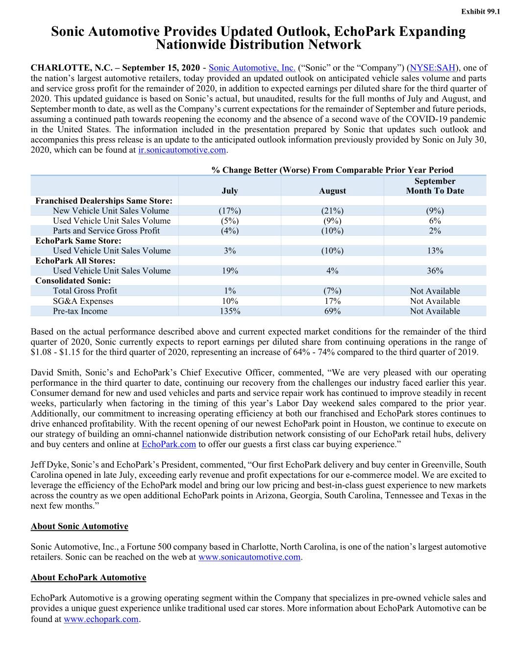 Exhibit 99.1 Sonic Automotive Provides Updated Outlook, EchoPark Expanding Nationwide Distribution Network CHARLOTTE, N.C. – September 15, 2020 - Sonic Automotive, Inc. (“Sonic” or the “Company”) (NYSE:SAH), one of the nation’s largest automotive retailers, today provided an updated outlook on anticipated vehicle sales volume and parts and service gross profit for the remainder of 2020, in addition to expected earnings per diluted share for the third quarter of 2020. This updated guidance is based on Sonic’s actual, but unaudited, results for the full months of July and August, and September month to date, as well as the Company’s current expectations for the remainder of September and future periods, assuming a continued path towards reopening the economy and the absence of a second wave of the COVID-19 pandemic in the United States. The information included in the presentation prepared by Sonic that updates such outlook and accompanies this press release is an update to the anticipated outlook information previously provided by Sonic on July 30, 2020, which can be found at ir.sonicautomotive.com. % Change Better (Worse) From Comparable Prior Year Period September July August Month To Date Franchised Dealerships Same Store: New Vehicle Unit Sales Volume (17%) (21%) (9%) Used Vehicle Unit Sales Volume (5%) (9%) 6% Parts and Service Gross Profit (4%) (10%) 2% EchoPark Same Store: Used Vehicle Unit Sales Volume 3% (10%) 13% EchoPark All Stores: Used Vehicle Unit Sales Volume 19% 4% 36% Consolidated Sonic: Total Gross Profit 1% (7%) Not Available SG&A Expenses 10% 17% Not Available Pre-tax Income 135% 69% Not Available Based on the actual performance described above and current expected market conditions for the remainder of the third quarter of 2020, Sonic currently expects to report earnings per diluted share from continuing operations in the range of $1.08 - $1.15 for the third quarter of 2020, representing an increase of 64% - 74% compared to the third quarter of 2019. David Smith, Sonic’s and EchoPark’s Chief Executive Officer, commented, “We are very pleased with our operating performance in the third quarter to date, continuing our recovery from the challenges our industry faced earlier this year. Consumer demand for new and used vehicles and parts and service repair work has continued to improve steadily in recent weeks, particularly when factoring in the timing of this year’s Labor Day weekend sales compared to the prior year. Additionally, our commitment to increasing operating efficiency at both our franchised and EchoPark stores continues to drive enhanced profitability. With the recent opening of our newest EchoPark point in Houston, we continue to execute on our strategy of building an omni-channel nationwide distribution network consisting of our EchoPark retail hubs, delivery and buy centers and online at EchoPark.com to offer our guests a first class car buying experience.” Jeff Dyke, Sonic’s and EchoPark’s President, commented, “Our first EchoPark delivery and buy center in Greenville, South Carolina opened in late July, exceeding early revenue and profit expectations for our e-commerce model. We are excited to leverage the efficiency of the EchoPark model and bring our low pricing and best-in-class guest experience to new markets across the country as we open additional EchoPark points in Arizona, Georgia, South Carolina, Tennessee and Texas in the next few months.” About Sonic Automotive Sonic Automotive, Inc., a Fortune 500 company based in Charlotte, North Carolina, is one of the nation’s largest automotive retailers. Sonic can be reached on the web at www.sonicautomotive.com. About EchoPark Automotive EchoPark Automotive is a growing operating segment within the Company that specializes in pre-owned vehicle sales and provides a unique guest experience unlike traditional used car stores. More information about EchoPark Automotive can be found at www.echopark.com.