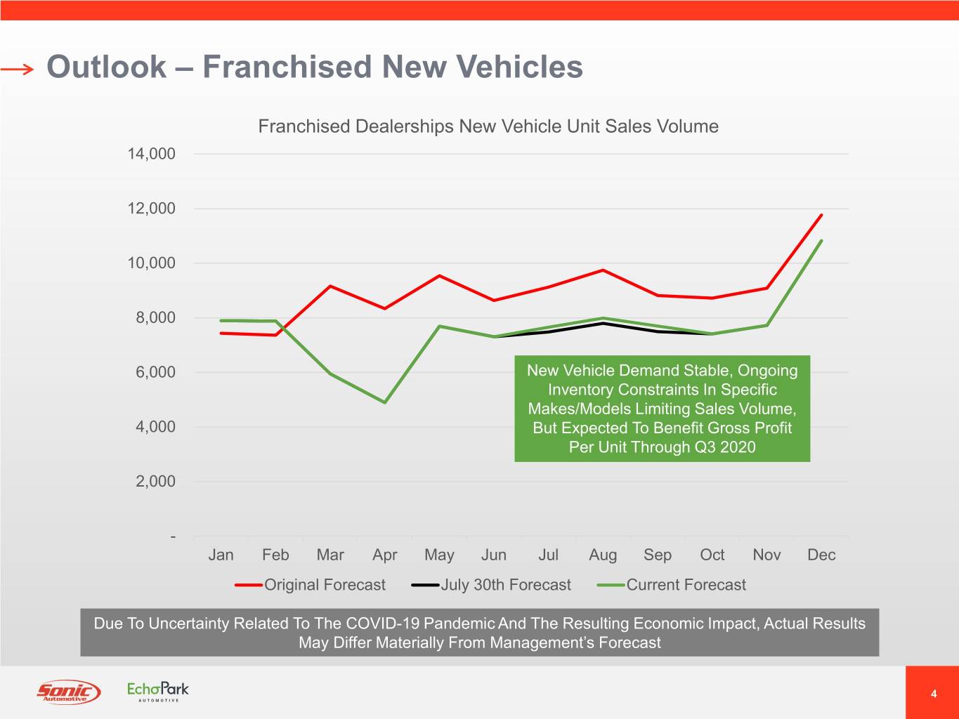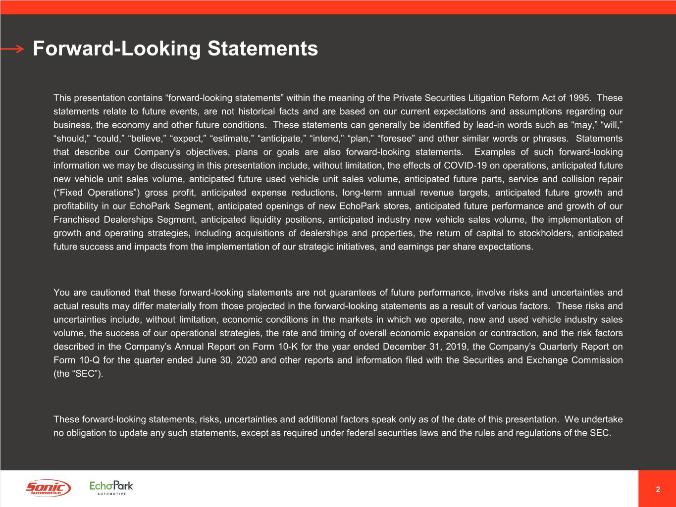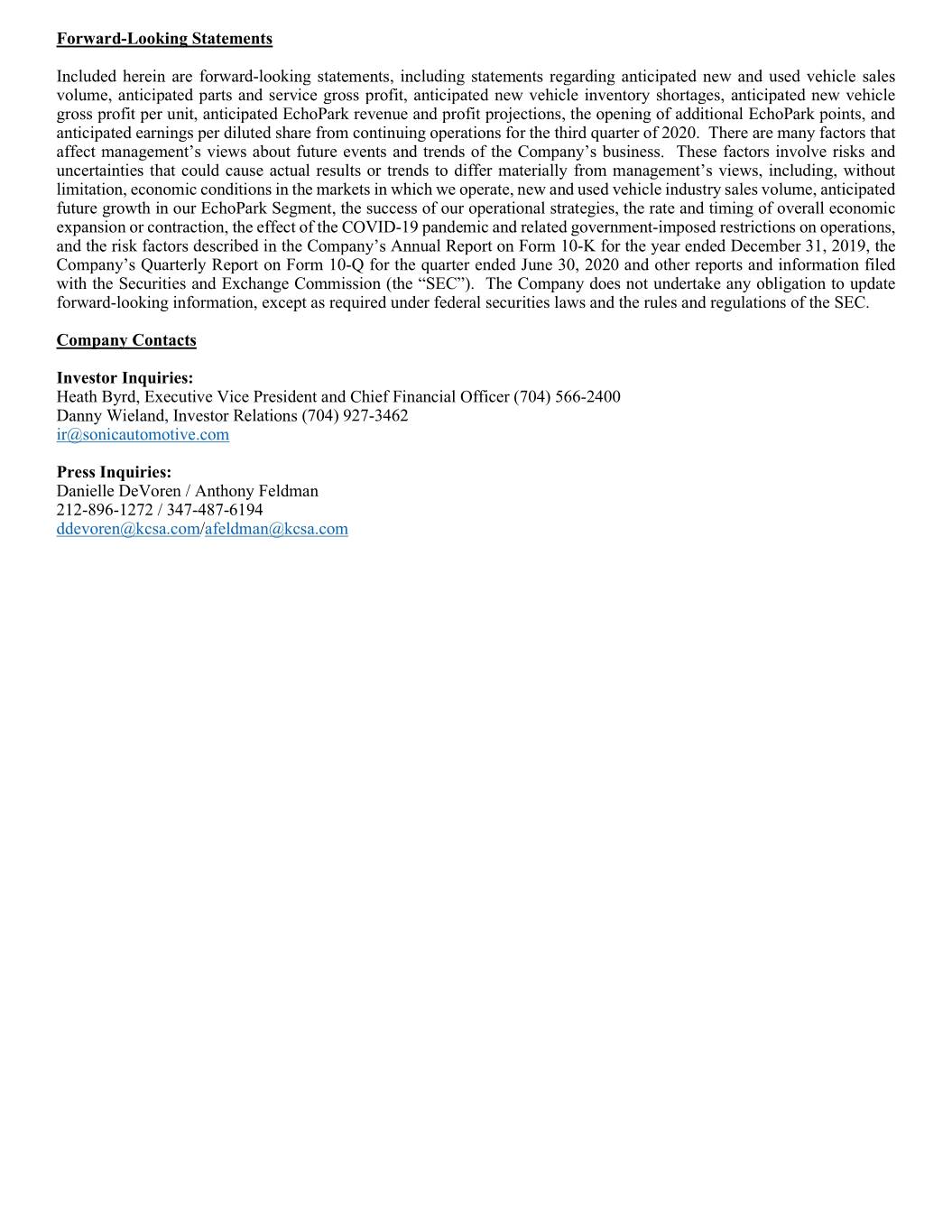 Forward-Looking Statements Included herein are forward-looking statements, including statements regarding anticipated new and used vehicle sales volume, anticipated parts and service gross profit, anticipated new vehicle inventory shortages, anticipated new vehicle gross profit per unit, anticipated EchoPark revenue and profit projections, the opening of additional EchoPark points, and anticipated earnings per diluted share from continuing operations for the third quarter of 2020. There are many factors that affect management’s views about future events and trends of the Company’s business. These factors involve risks and uncertainties that could cause actual results or trends to differ materially from management’s views, including, without limitation, economic conditions in the markets in which we operate, new and used vehicle industry sales volume, anticipated future growth in our EchoPark Segment, the success of our operational strategies, the rate and timing of overall economic expansion or contraction, the effect of the COVID-19 pandemic and related government-imposed restrictions on operations, and the risk factors described in the Company’s Annual Report on Form 10-K for the year ended December 31, 2019, the Company’s Quarterly Report on Form 10-Q for the quarter ended June 30, 2020 and other reports and information filed with the Securities and Exchange Commission (the “SEC”). The Company does not undertake any obligation to update forward-looking information, except as required under federal securities laws and the rules and regulations of the SEC. Company Contacts Investor Inquiries: Heath Byrd, Executive Vice President and Chief Financial Officer (704) 566-2400 Danny Wieland, Investor Relations (704) 927-3462 ir@sonicautomotive.com Press Inquiries: Danielle DeVoren / Anthony Feldman 212-896-1272 / 347-487-6194 ddevoren@kcsa.com/afeldman@kcsa.com