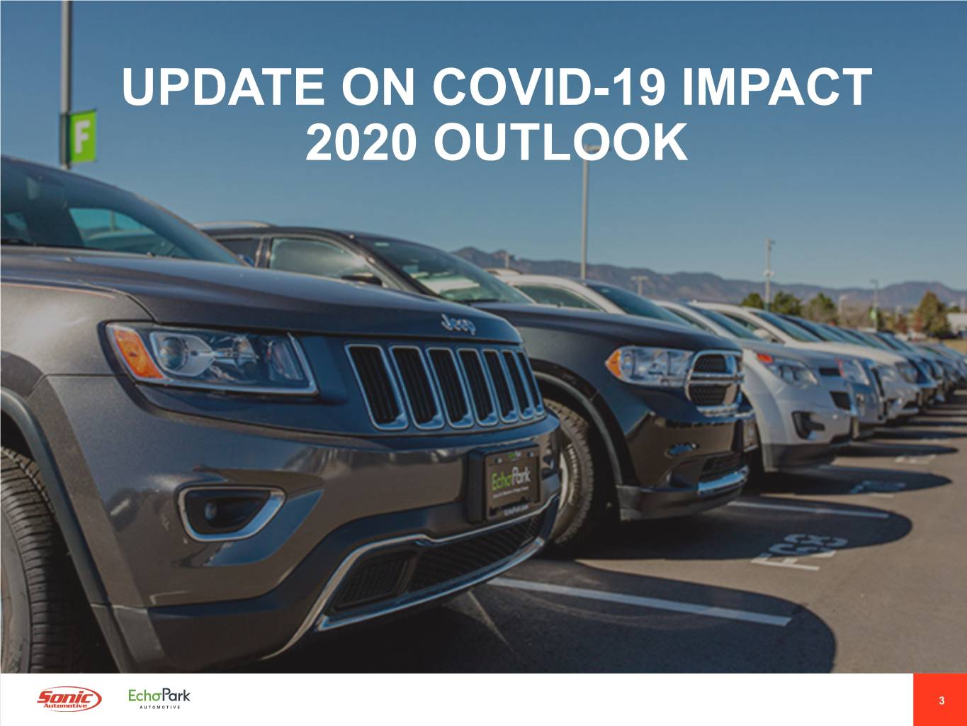 Forward-Looking Statements This presentation contains “forward-looking statements” within the meaning of the Private Securities Litigation Reform Act of 1995. These statements relate to future events, are not historical facts and are based on our current expectations and assumptions regarding our business, the economy and other future conditions. These statements can generally be identified by lead-in words such as “may,” “will,” “should,” “could,” “believe,” “expect,” “estimate,” “anticipate,” “intend,” “plan,” “foresee” and other similar words or phrases. Statements that describe our Company’s objectives, plans or goals are also forward-looking statements. Examples of such forward-looking information we may be discussing in this presentation include, without limitation, the effects of COVID-19 on operations, anticipated future new vehicle unit sales volume, anticipated future used vehicle unit sales volume, anticipated future parts, service and collision repair (“Fixed Operations”) gross profit, anticipated expense reductions, long-term annual revenue targets, anticipated future growth and profitability in our EchoPark Segment, anticipated openings of new EchoPark stores, anticipated future performance and growth of our Franchised Dealerships Segment, anticipated liquidity positions, anticipated industry new vehicle sales volume, the implementation of growth and operating strategies, including acquisitions of dealerships and properties, the return of capital to stockholders, anticipated future success and impacts from the implementation of our strategic initiatives, and earnings per share expectations. You are cautioned that these forward-looking statements are not guarantees of future performance, involve risks and uncertainties and actual results may differ materially from those projected in the forward-looking statements as a result of various factors. These risks and uncertainties include, without limitation, economic conditions in the markets in which we operate, new and used vehicle industry sales volume, the success of our operational strategies, the rate and timing of overall economic expansion or contraction, and the risk factors described in the Company’s Annual Report on Form 10-K for the year ended December 31, 2019, the Company’s Quarterly Report on Form 10-Q for the quarter ended June 30, 2020 and other reports and information filed with the Securities and Exchange Commission (the “SEC”). These forward-looking statements, risks, uncertainties and additional factors speak only as of the date of this presentation. We undertake no obligation to update any such statements, except as required under federal securities laws and the rules and regulations of the SEC. 2