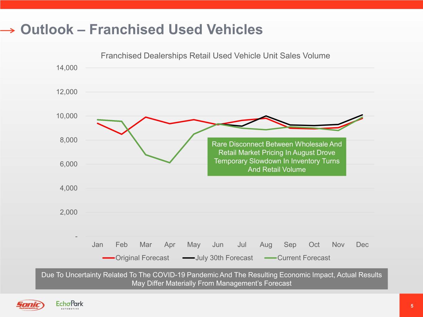 Outlook – Franchised New Vehicles Franchised Dealerships New Vehicle Unit Sales Volume 14,000 12,000 10,000 8,000 6,000 New Vehicle Demand Stable, Ongoing Inventory Constraints In Specific Makes/Models Limiting Sales Volume, 4,000 But Expected To Benefit Gross Profit Per Unit Through Q3 2020 2,000 - Jan Feb Mar Apr May Jun Jul Aug Sep Oct Nov Dec Original Forecast July 30th Forecast Current Forecast Due To Uncertainty Related To The COVID-19 Pandemic And The Resulting Economic Impact, Actual Results May Differ Materially From Management’s Forecast 4