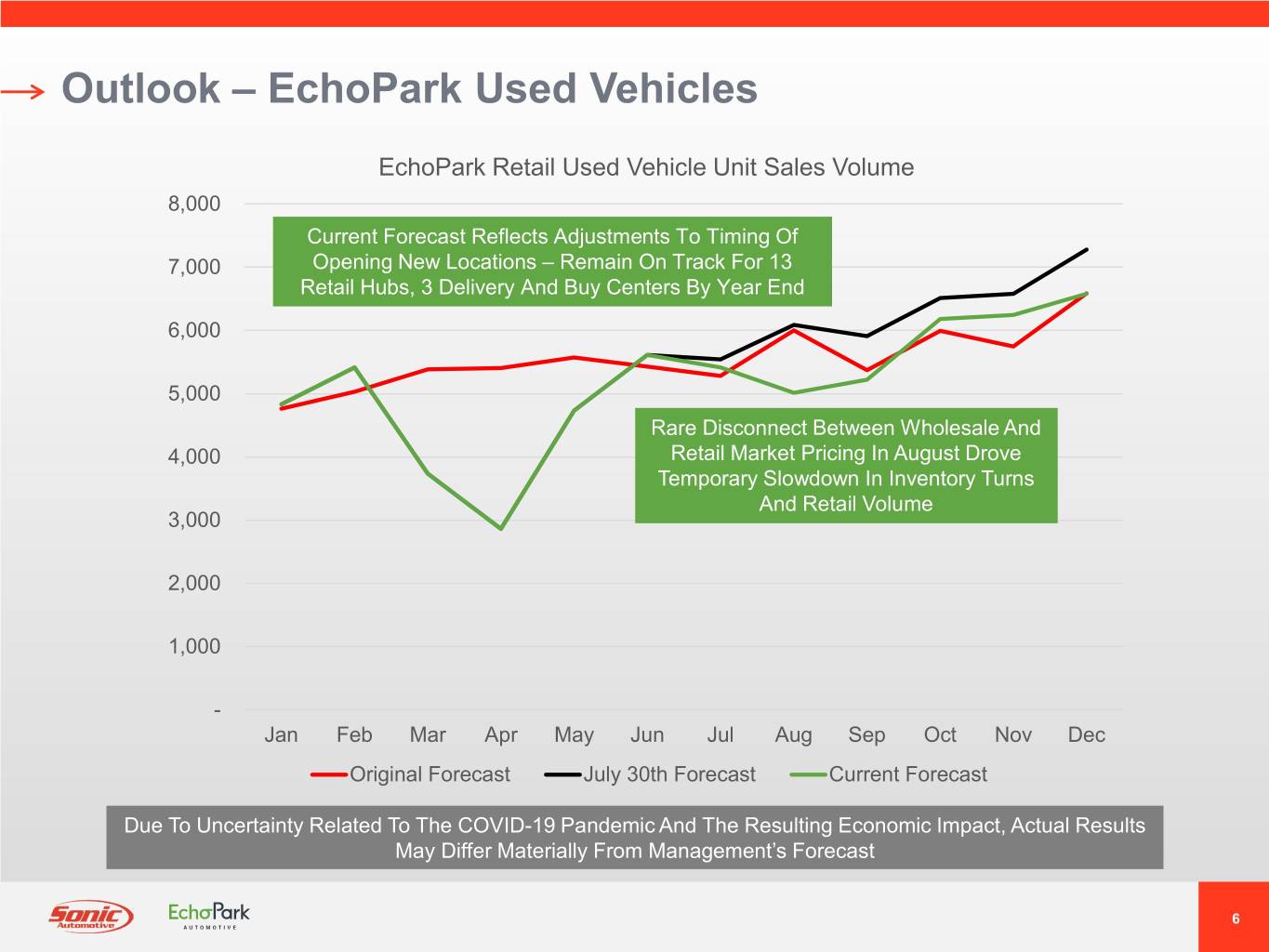 Outlook – Franchised Used Vehicles Franchised Dealerships Retail Used Vehicle Unit Sales Volume 14,000 12,000 10,000 8,000 Rare Disconnect Between Wholesale And Retail Market Pricing In August Drove 6,000 Temporary Slowdown In Inventory Turns And Retail Volume 4,000 2,000 - Jan Feb Mar Apr May Jun Jul Aug Sep Oct Nov Dec Original Forecast July 30th Forecast Current Forecast Due To Uncertainty Related To The COVID-19 Pandemic And The Resulting Economic Impact, Actual Results May Differ Materially From Management’s Forecast 5
