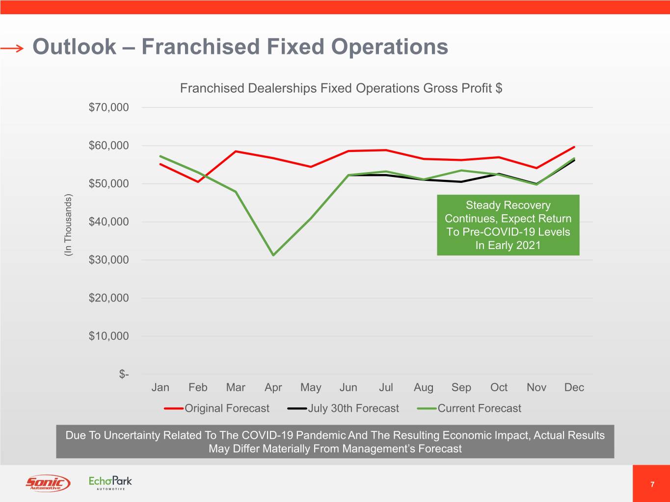Outlook – EchoPark Used Vehicles EchoPark Retail Used Vehicle Unit Sales Volume 8,000 Current Forecast Reflects Adjustments To Timing Of 7,000 Opening New Locations – Remain On Track For 13 Retail Hubs, 3 Delivery And Buy Centers By Year End 6,000 5,000 Rare Disconnect Between Wholesale And 4,000 Retail Market Pricing In August Drove Temporary Slowdown In Inventory Turns And Retail Volume 3,000 2,000 1,000 - Jan Feb Mar Apr May Jun Jul Aug Sep Oct Nov Dec Original Forecast July 30th Forecast Current Forecast Due To Uncertainty Related To The COVID-19 Pandemic And The Resulting Economic Impact, Actual Results May Differ Materially From Management’s Forecast 6
