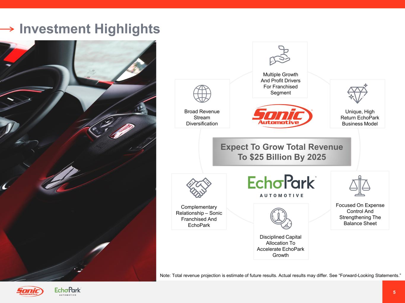 4 ® Sonic Automotive: Who We Are QUICK FACTS (NYSE: SAH) a Fortune 500 Company and One of the Nation’s Largest Automotive Retailers 107 20+ 14 14 $9.8 Billion $1.4 Billion 93K New Vehicles Sold 159K Total Revenues Automotive Brands Locations Used Vehicles Sold States Collision Centers Gross Profit Note: Revenue, Gross Profit, New & Used Vehicles Sold are for FY 2020 Our Core Franchised Dealerships Segment is a Full-Service Automotive Retailer, Selling New and Used Vehicles, Arranging F&I Product Sales, and Providing Parts, Service and Collision Repair Our High Growth EchoPark Segment Offers a Unique Approach to Pre-Owned Vehicle and F&I Sales Below-Market Pricing with a No Haggle Purchase Experience Drives Industry-Leading Used Vehicle Volume Throughput