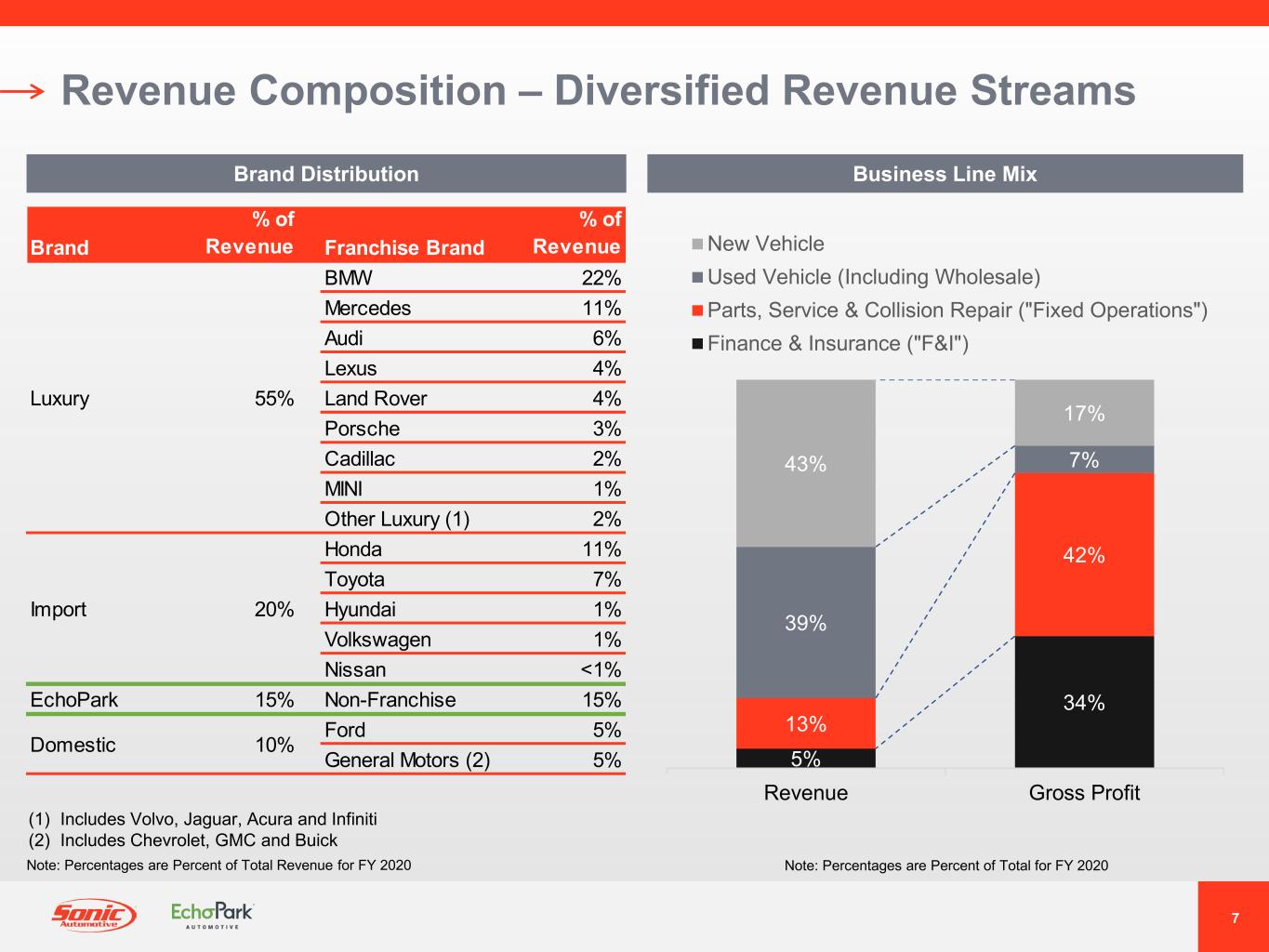 6 Revenue Composition BY GEOGRAPHY TX 28% CA 26%CO 10% TN 7% FL 7% AL 6% NC 5% GA 3% VA 2% MD 2% SC 2% NV 2% Concentrated in Major Metro Markets Geographic Footprint, Revenue Streams and Brand Mix Offer Attractive Diversification Across the Automotive Retail Space Note: Percentages are Percent of Total Revenue for FY 2020