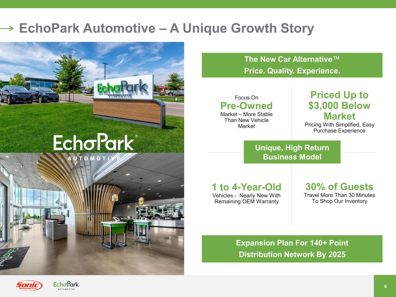 7 Revenue Composition – Diversified Revenue Streams Note: Percentages are Percent of Total for FY 2020 5% 34% 13% 42% 39% 7%43% 17% Revenue Gross Profit New Vehicle Used Vehicle (Including Wholesale) Parts, Service & Collision Repair ("Fixed Operations") Finance & Insurance ("F&I") Brand Distribution Note: Percentages are Percent of Total Revenue for FY 2020 Brand % of Revenue Franchise Brand % of Revenue BMW 22% Mercedes 11% Audi 6% Lexus 4% Land Rover 4% Porsche 3% Cadillac 2% MINI 1% Other Luxury (1) 2% Honda 11% Toyota 7% Hyundai 1% Volkswagen 1% Nissan <1% EchoPark 15% Non-Franchise 15% Ford 5% General Motors (2) 5% Luxury 55% 20%Import Domestic 10% (1) Includes Volvo, Jaguar, Acura and Infiniti (2) Includes Chevrolet, GMC and Buick Business Line Mix