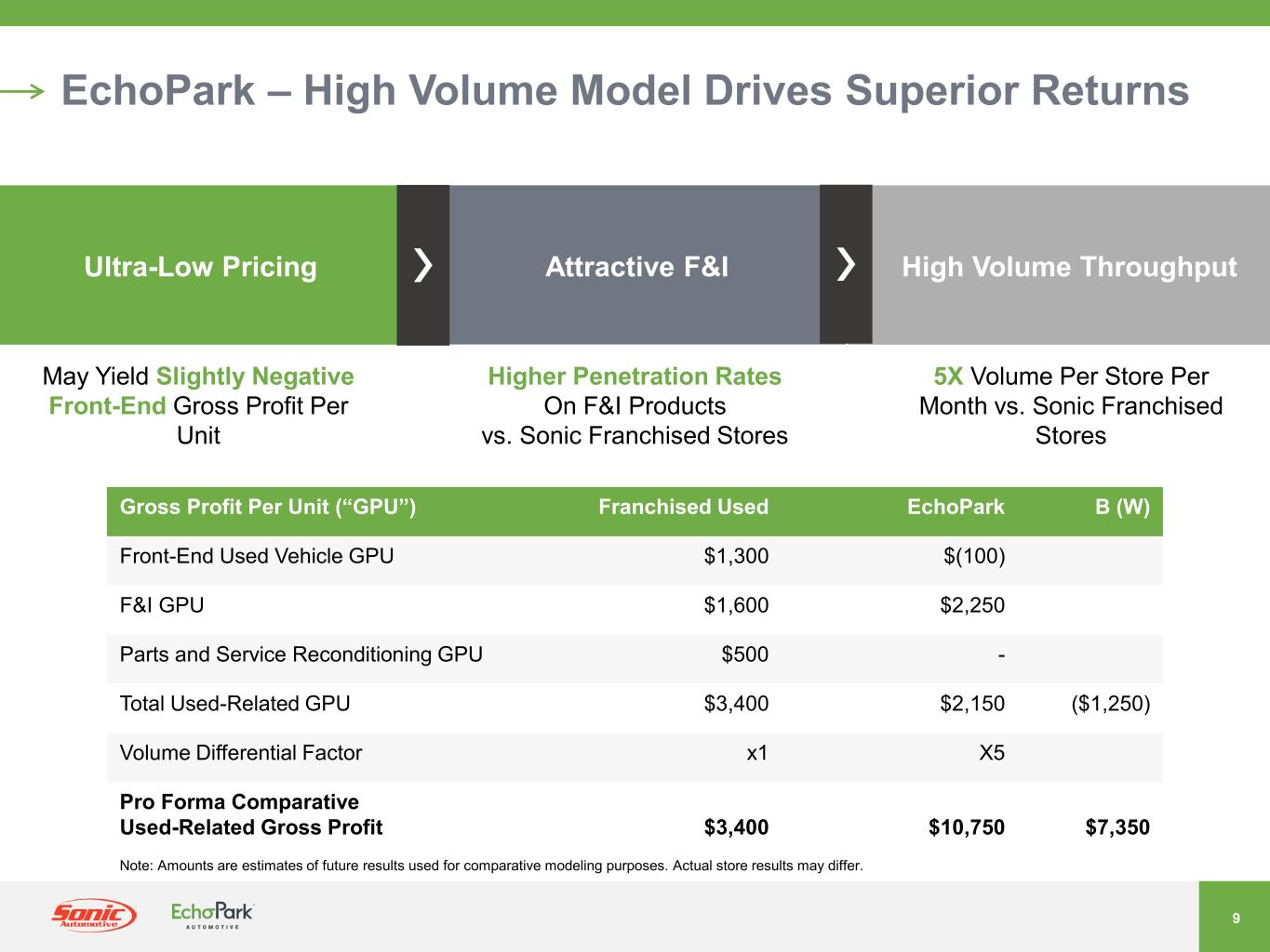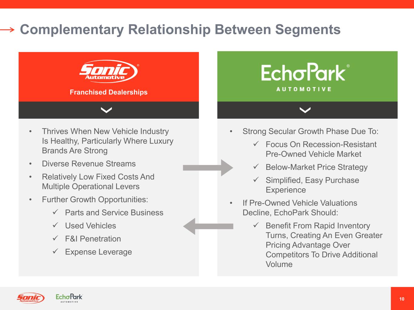 9 EchoPark – High Volume Model Drives Superior Returns Gross Profit Per Unit (“GPU”) Franchised Used EchoPark B (W) Front-End Used Vehicle GPU $1,300 $(100) F&I GPU $1,600 $2,250 Parts and Service Reconditioning GPU $500 - Total Used-Related GPU $3,400 $2,150 ($1,250) Volume Differential Factor x1 X5 Pro Forma Comparative Used-Related Gross Profit $3,400 $10,750 $7,350 Ultra-Low Pricing Attractive F&I High Volume Throughput May Yield Slightly Negative Front-End Gross Profit Per Unit Higher Penetration Rates On F&I Products vs. Sonic Franchised Stores 5X Volume Per Store Per Month vs. Sonic Franchised Stores Note: Amounts are estimates of future results used for comparative modeling purposes. Actual store results may differ.