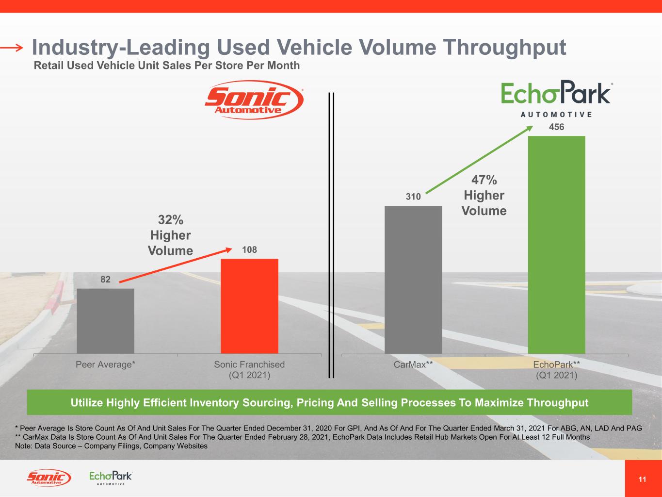 10 Franchised Dealerships ® ® Complementary Relationship Between Segments • Thrives When New Vehicle Industry Is Healthy, Particularly Where Luxury Brands Are Strong • Diverse Revenue Streams • Relatively Low Fixed Costs And Multiple Operational Levers • Further Growth Opportunities: Parts and Service Business Used Vehicles F&I Penetration Expense Leverage • Strong Secular Growth Phase Due To: Focus On Recession-Resistant Pre-Owned Vehicle Market Below-Market Price Strategy Simplified, Easy Purchase Experience • If Pre-Owned Vehicle Valuations Decline, EchoPark Should: Benefit From Rapid Inventory Turns, Creating An Even Greater Pricing Advantage Over Competitors To Drive Additional Volume