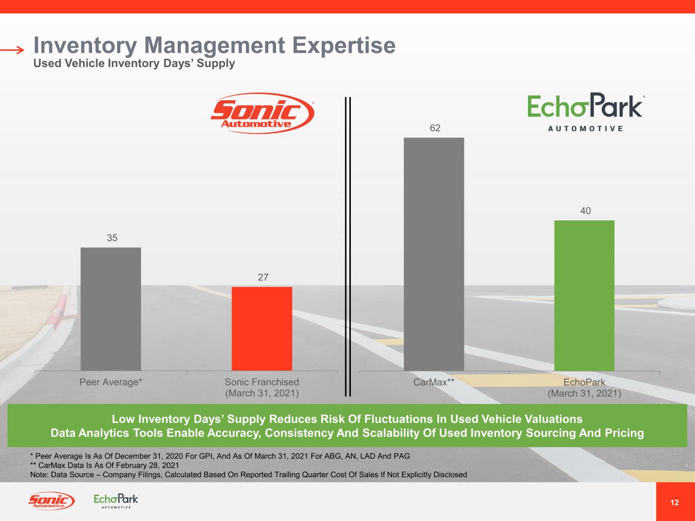 11 Industry-Leading Used Vehicle Volume Throughput 82 108 Peer Average* Sonic Franchised (Q1 2021) * Peer Average Is Store Count As Of And Unit Sales For The Quarter Ended December 31, 2020 For GPI, And As Of And For The Quarter Ended March 31, 2021 For ABG, AN, LAD And PAG ** CarMax Data Is Store Count As Of And Unit Sales For The Quarter Ended February 28, 2021, EchoPark Data Includes Retail Hub Markets Open For At Least 12 Full Months Note: Data Source – Company Filings, Company Websites 310 456 CarMax** EchoPark** (Q1 2021) Utilize Highly Efficient Inventory Sourcing, Pricing And Selling Processes To Maximize Throughput Retail Used Vehicle Unit Sales Per Store Per Month 32% Higher Volume 47% Higher Volume