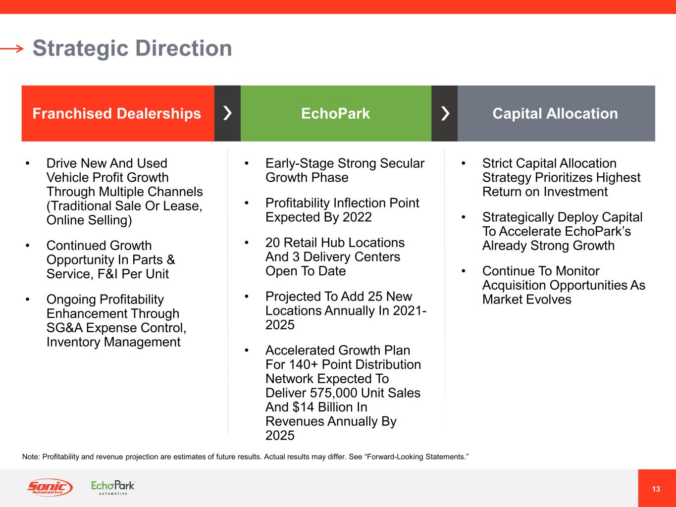 12 35 27 Peer Average* Sonic Franchised (March 31, 2021) * Peer Average Is As Of December 31, 2020 For GPI, And As Of March 31, 2021 For ABG, AN, LAD And PAG ** CarMax Data Is As Of February 28, 2021 Note: Data Source – Company Filings, Calculated Based On Reported Trailing Quarter Cost Of Sales If Not Explicitly Disclosed 62 40 CarMax** EchoPark (March 31, 2021) Low Inventory Days’ Supply Reduces Risk Of Fluctuations In Used Vehicle Valuations Data Analytics Tools Enable Accuracy, Consistency And Scalability Of Used Inventory Sourcing And Pricing Inventory Management Expertise Used Vehicle Inventory Days’ Supply