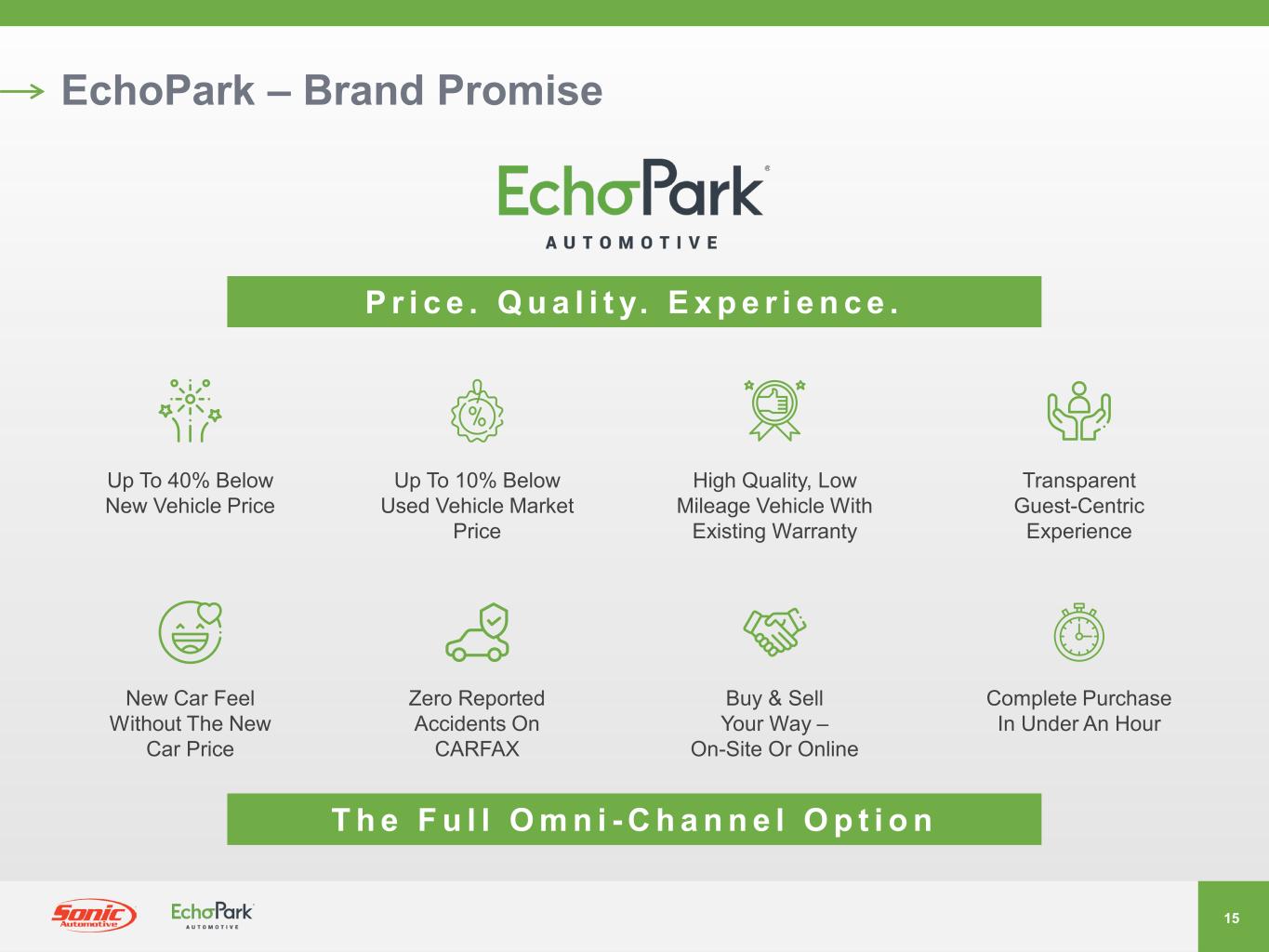 15 EchoPark – Brand Promise Up To 40% Below New Vehicle Price Up To 10% Below Used Vehicle Market Price High Quality, Low Mileage Vehicle With Existing Warranty Transparent Guest-Centric Experience New Car Feel Without The New Car Price Complete Purchase In Under An Hour Zero Reported Accidents On CARFAX Buy & Sell Your Way – On-Site Or Online P r i c e . Q u a l i t y. E x p e r i e n c e . T h e F u l l O m n i - C h a n n e l O p t i o n