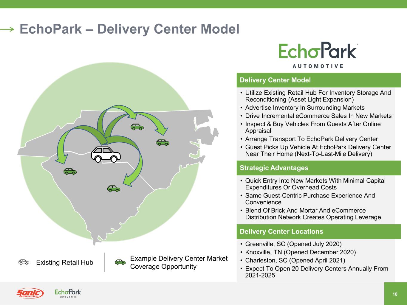 17 EchoPark – Modeled 4-Wall Economics At Maturity (Modeled Metrics Assume 100% Maturity) Delivery Center Medium Retail Hub Large Retail Hub Average Monthly Retail Unit Volume 300 750 1,500 Average Vehicle Selling Price 20,500$ 20,500$ 20,500$ Total Annual Revenues 82,000,000$ 205,000,000$ 410,000,000$ Total Combined Gross Profit Per Unit Retailed ("GPU") 1,700$ 2,150$ 2,150$ Target SG&A Expenses as % of Gross Profit 65% 60% 60% Annual Pre-Tax Profit 2,100,000$ 7,200,000$ 14,400,000$ Average Compensation Per Employee (with Fringe) 68,000$ 78,000$ 78,000$ Total Headcount 7 105 170 Sales Experience Guide ("EG") Headcount N/A 25 50 Average Retail Unit Sales Per EG Per Month N/A 30 30 Target Inventory Days' Supply N/A 30 Days 30 Days Working Capital Investment -$ 15,000,000$ 31,000,000$ Inventory Floor Plan Financing -$ (15,000,000)$ (31,000,000)$ Capital Expenditures, Including Land (Varies By Market) $1-$2 Million $7-$12 Million $20-$25 Million Estimated Months to Breakeven 3-6 Months 6-9 Months 6-9 Months Estimated Years to Maturity 2 Years 4 Years 5 Years Pre-Tax Return On Investment 55%+ 35% - 50% 28% - 33% Note: Estimated average pre-tax losses of $1.5 to $2.0 million per new medium or large retail hub opening (~40% incurred in 3 months prior to opening, ~60% incurred post- opening prior to targeted breakeven). Pre-tax losses for new Delivery Center locations are expected to be approximately $0.2 million per location prior to targeted breakeven. Note: Amounts are estimates of future results used for comparative modeling purposes. Actual store results may differ. See “Forward-Looking Statements.”