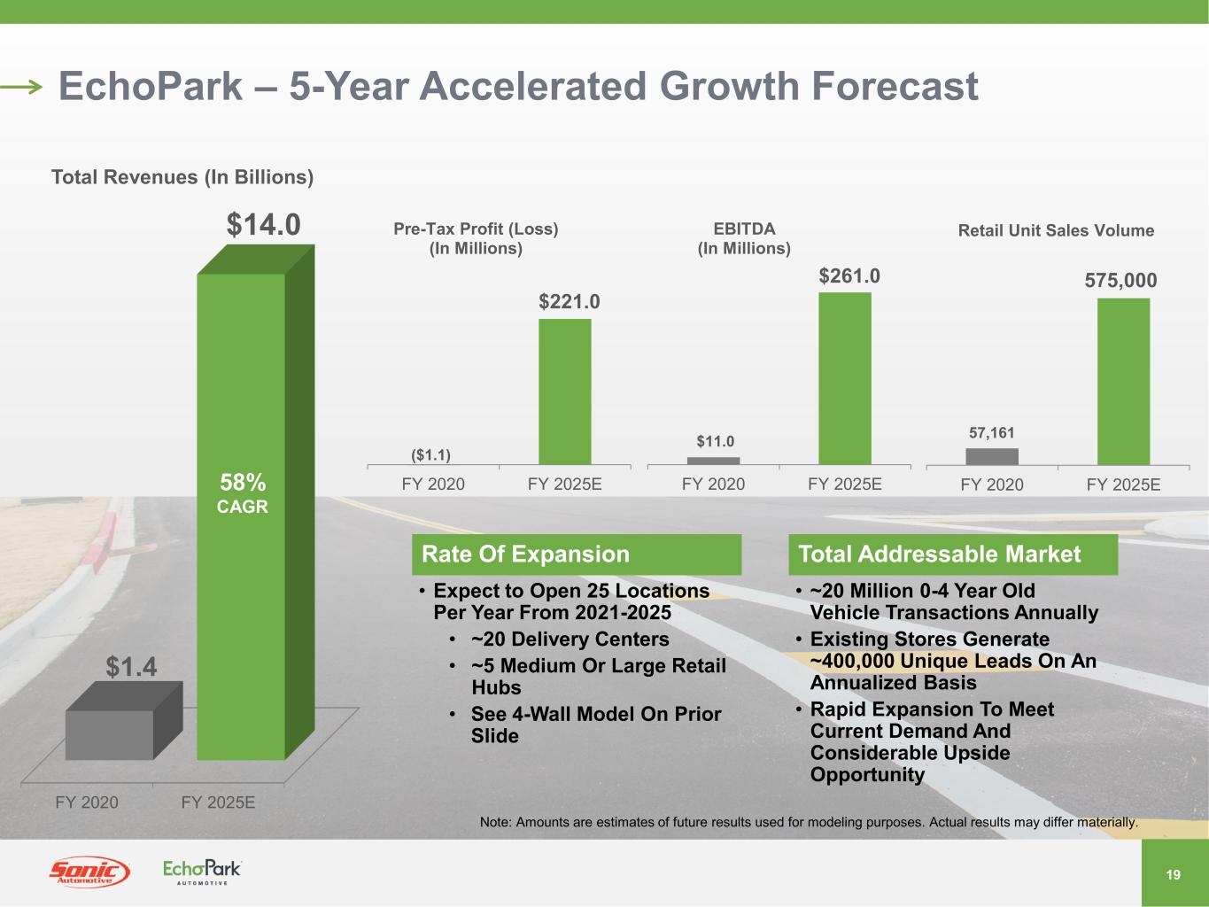 18 EchoPark – Delivery Center Model Existing Retail Hub Example Delivery Center Market Coverage Opportunity Delivery Center Model • Utilize Existing Retail Hub For Inventory Storage And Reconditioning (Asset Light Expansion) • Advertise Inventory In Surrounding Markets • Drive Incremental eCommerce Sales In New Markets • Inspect & Buy Vehicles From Guests After Online Appraisal • Arrange Transport To EchoPark Delivery Center • Guest Picks Up Vehicle At EchoPark Delivery Center Near Their Home (Next-To-Last-Mile Delivery) Strategic Advantages • Quick Entry Into New Markets With Minimal Capital Expenditures Or Overhead Costs • Same Guest-Centric Purchase Experience And Convenience • Blend Of Brick And Mortar And eCommerce Distribution Network Creates Operating Leverage Delivery Center Locations • Greenville, SC (Opened July 2020) • Knoxville, TN (Opened December 2020) • Charleston, SC (Opened April 2021) • Expect To Open 20 Delivery Centers Annually From 2021-2025