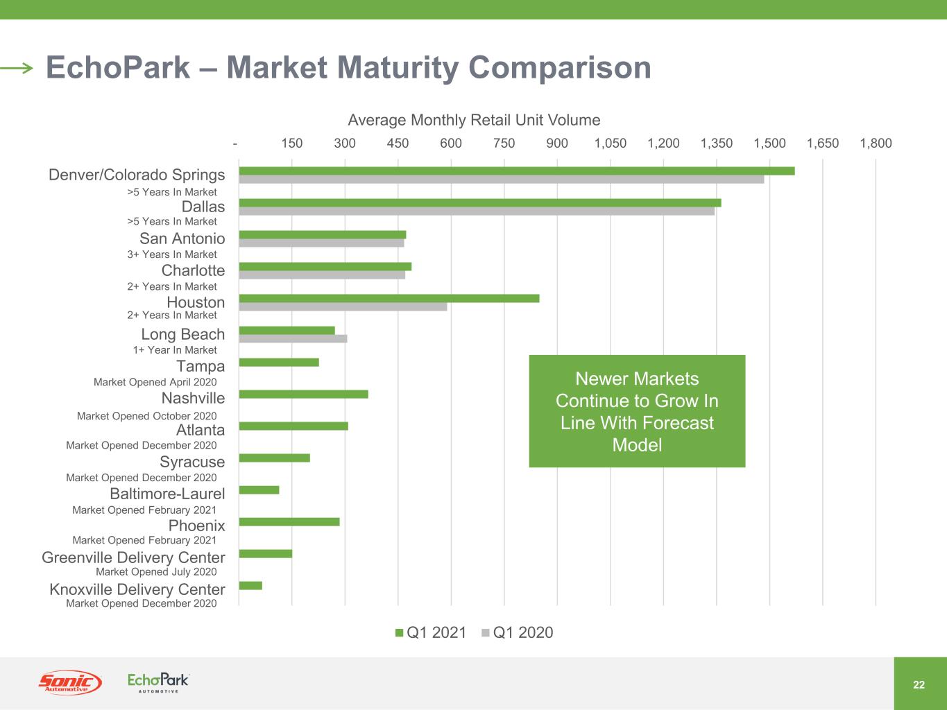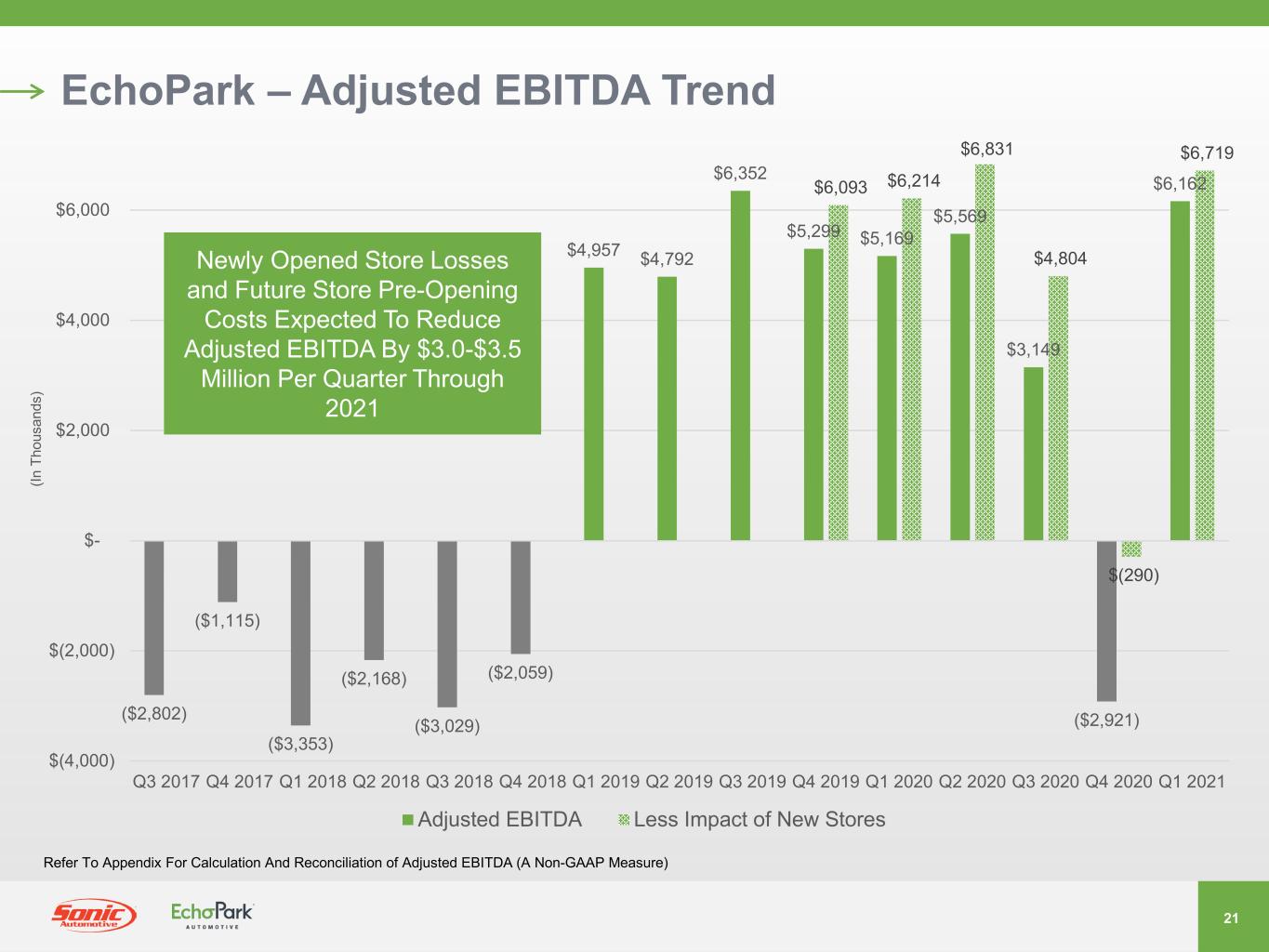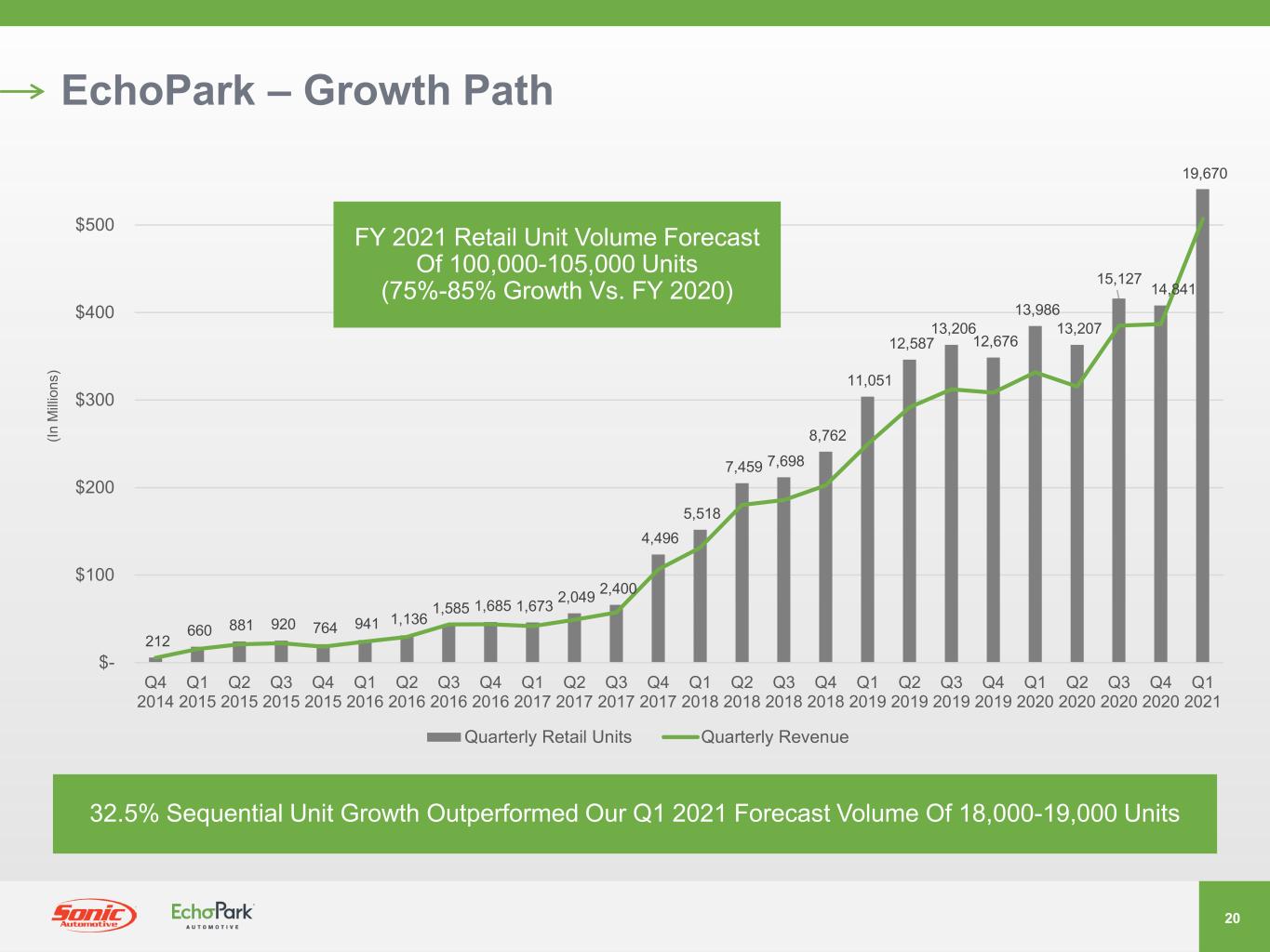20 EchoPark – Growth Path 212 660 881 920 764 941 1,136 1,585 1,685 1,673 2,049 2,400 4,496 5,518 7,459 7,698 8,762 11,051 12,587 13,206 12,676 13,986 13,207 15,127 14,841 19,670 $- $100 $200 $300 $400 $500 Q4 2014 Q1 2015 Q2 2015 Q3 2015 Q4 2015 Q1 2016 Q2 2016 Q3 2016 Q4 2016 Q1 2017 Q2 2017 Q3 2017 Q4 2017 Q1 2018 Q2 2018 Q3 2018 Q4 2018 Q1 2019 Q2 2019 Q3 2019 Q4 2019 Q1 2020 Q2 2020 Q3 2020 Q4 2020 Q1 2021 (In M ill io ns ) Quarterly Retail Units Quarterly Revenue FY 2021 Retail Unit Volume Forecast Of 100,000-105,000 Units (75%-85% Growth Vs. FY 2020) 32.5% Sequential Unit Growth Outperformed Our Q1 2021 Forecast Volume Of 18,000-19,000 Units