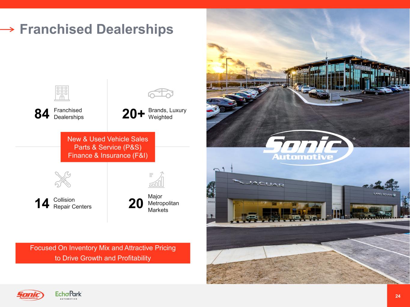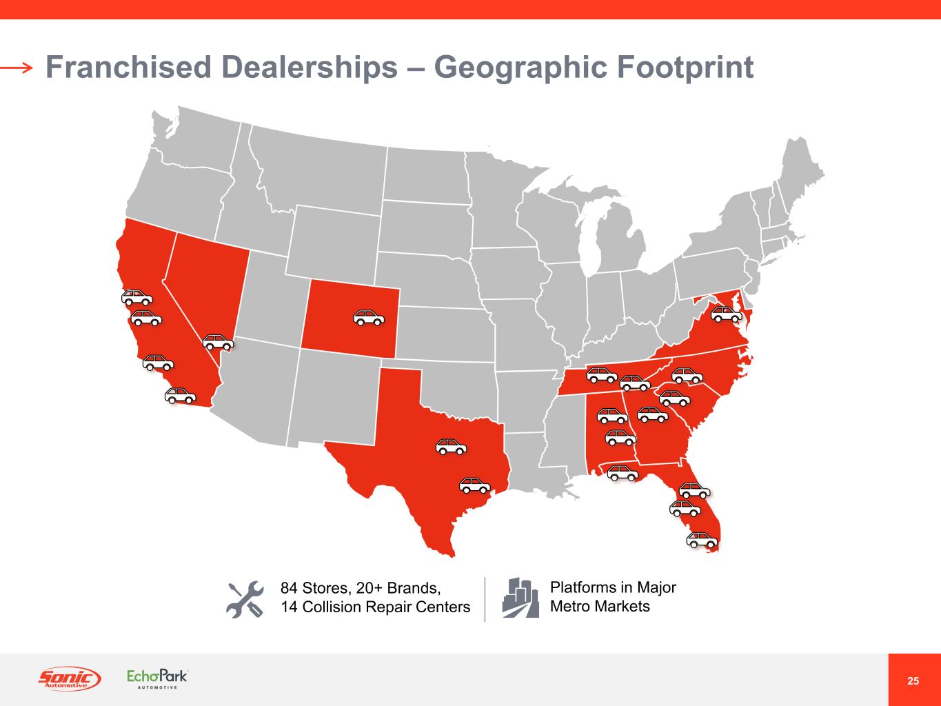 24 New & Used Vehicle Sales Parts & Service (P&S) Finance & Insurance (F&I) ® Franchised Dealerships Franchised Dealerships84 Brands, Luxury Weighted20+ New & hicle Sales Parts & r i (P&S) Finance & Insurance (F&I) Collision Repair Centers14 20 Major Metropolitan Markets Focused On Inventory Mix and Attractive Pricing to Drive Growth and Profitability