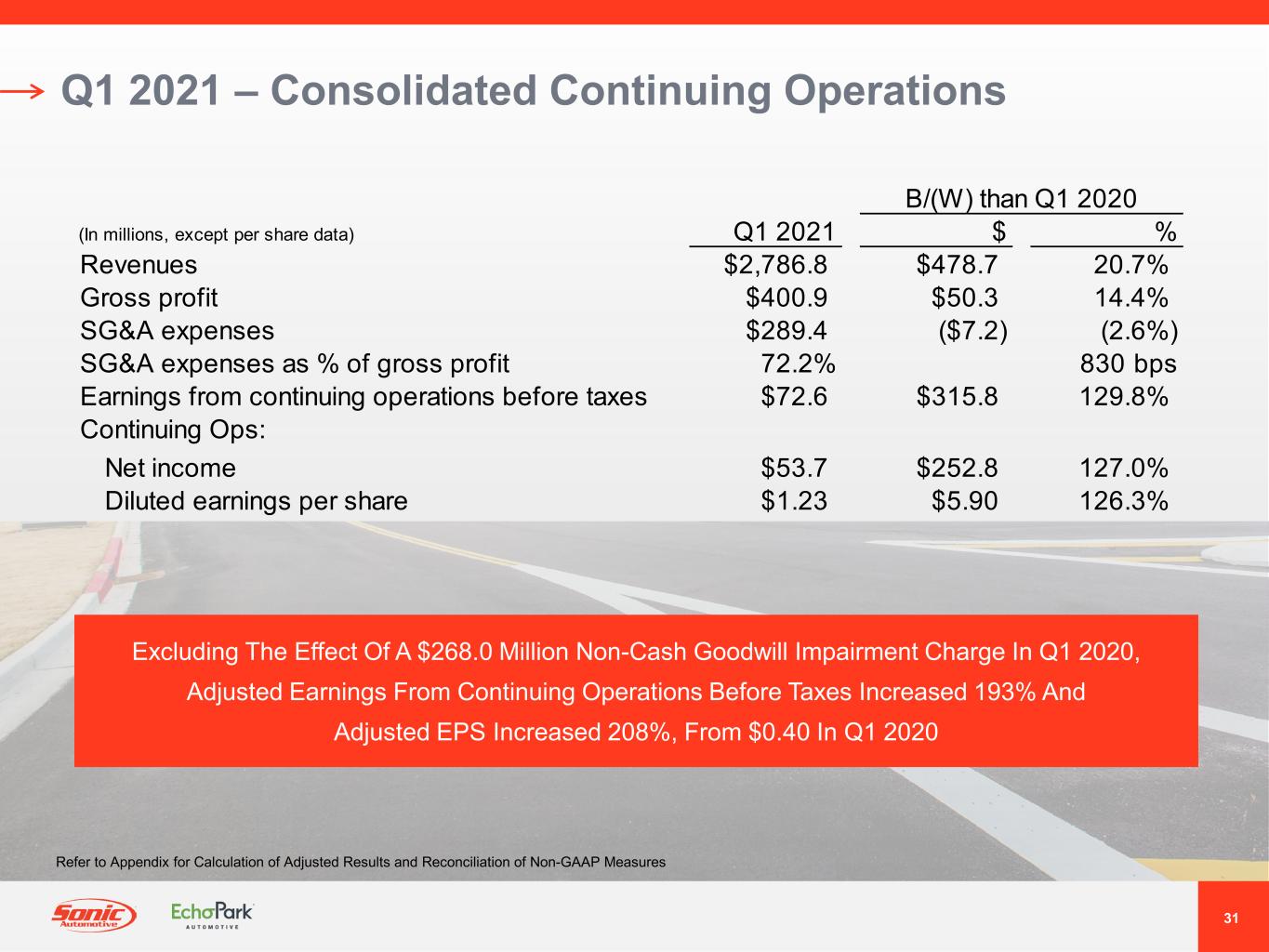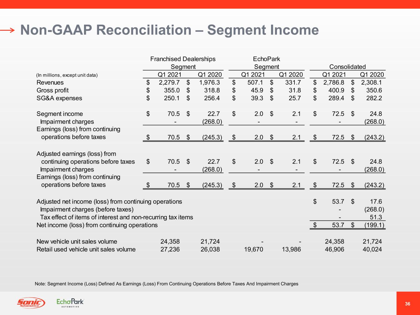 36 Non-GAAP Reconciliation – Segment Income Franchised Dealerships Segment EchoPark Segment Consolidated (In millions, except unit data) Q1 2021 Q1 2020 Q1 2021 Q1 2020 Q1 2021 Q1 2020 Revenues 2,279.7$ 1,976.3$ 507.1$ 331.7$ 2,786.8$ 2,308.1$ Gross profit 355.0$ 318.8$ 45.9$ 31.8$ 400.9$ 350.6$ SG&A expenses 250.1$ 256.4$ 39.3$ 25.7$ 289.4$ 282.2$ Segment income 70.5$ 22.7$ 2.0$ 2.1$ 72.5$ 24.8$ Impairment charges - (268.0) - - - (268.0) Earnings (loss) from continuing operations before taxes 70.5$ (245.3)$ 2.0$ 2.1$ 72.5$ (243.2)$ Adjusted earnings (loss) from continuing operations before taxes 70.5$ 22.7$ 2.0$ 2.1$ 72.5$ 24.8$ Impairment charges - (268.0) - - - (268.0) Earnings (loss) from continuing operations before taxes 70.5$ (245.3)$ 2.0$ 2.1$ 72.5$ (243.2)$ Adjusted net income (loss) from continuing operations 53.7$ 17.6$ Impairment charges (before taxes) - (268.0) Tax effect of items of interest and non-recurring tax items - 51.3 Net income (loss) from continuing operations 53.7$ (199.1)$ New vehicle unit sales volume 24,358 21,724 - - 24,358 21,724 Retail used vehicle unit sales volume 27,236 26,038 19,670 13,986 46,906 40,024 Note: Segment Income (Loss) Defined As Earnings (Loss) From Continuing Operations Before Taxes And Impairment Charges
