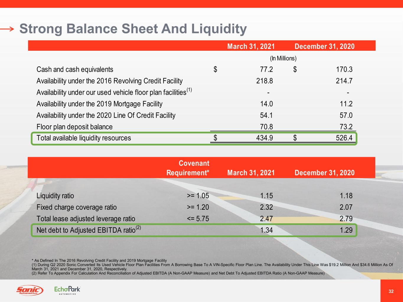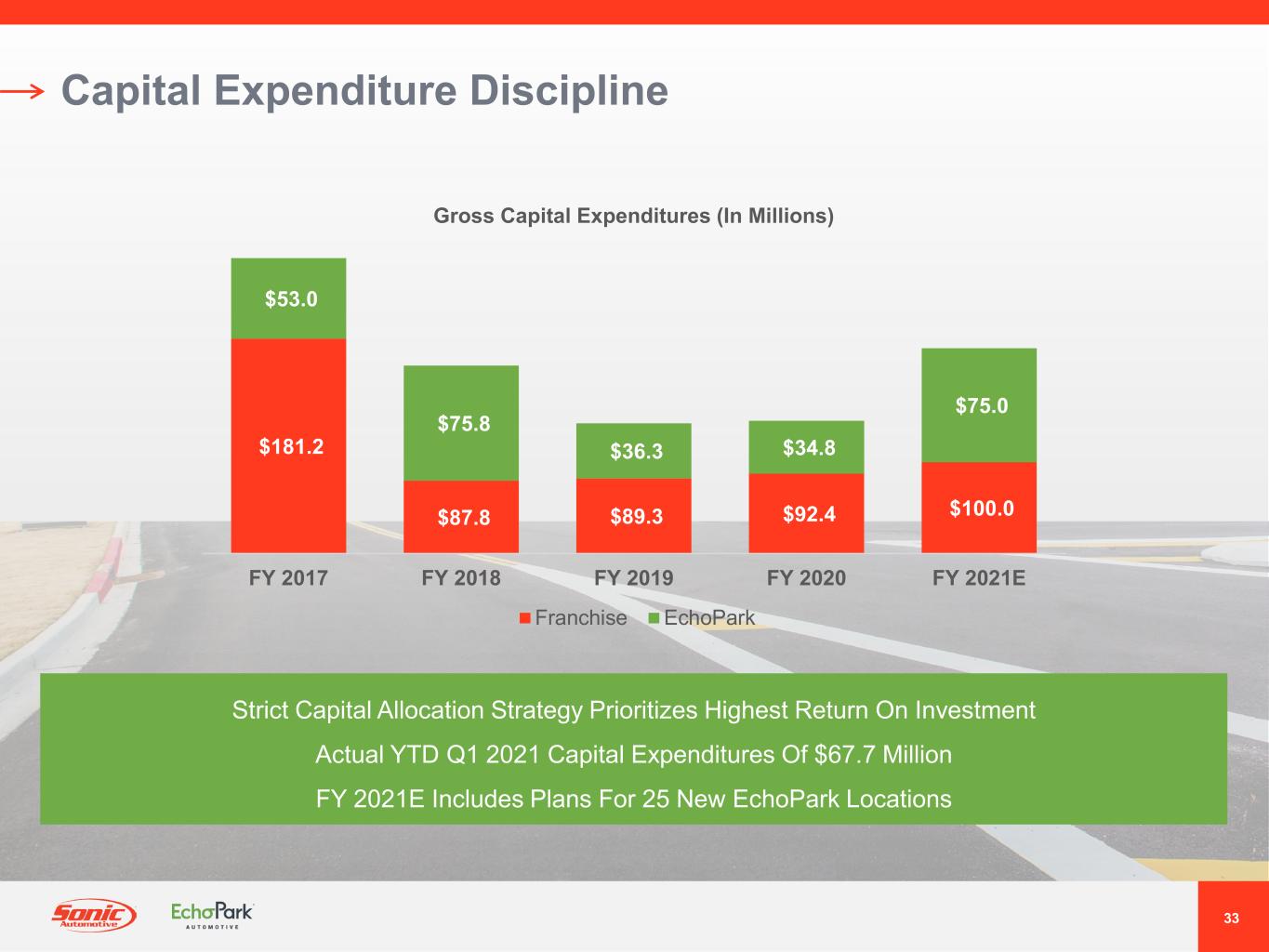 32 Strong Balance Sheet And Liquidity March 31, 2021 December 31, 2020 (In Millions) Cash and cash equivalents 77.2$ 170.3$ Availability under the 2016 Revolving Credit Facility 218.8 214.7 Availability under our used vehicle floor plan facilities(1) - - Availability under the 2019 Mortgage Facility 14.0 11.2 Availability under the 2020 Line Of Credit Facility 54.1 57.0 Floor plan deposit balance 70.8 73.2 Total available liquidity resources 434.9$ 526.4$ Covenant Requirement* March 31, 2021 December 31, 2020 Liquidity ratio >= 1.05 1.15 1.18 Fixed charge coverage ratio >= 1.20 2.32 2.07 Total lease adjusted leverage ratio <= 5.75 2.47 2.79 Net debt to Adjusted EBITDA ratio(2) 1.34 1.29 * As Defined In The 2016 Revolving Credit Facility and 2019 Mortgage Facility (1) During Q2 2020 Sonic Converted Its Used Vehicle Floor Plan Facilities From A Borrowing Base To A VIN-Specific Floor Plan Line. The Availability Under This Line Was $19.2 Million And $34.6 Million As Of March 31, 2021 and December 31, 2020, Respectively. (2) Refer To Appendix For Calculation And Reconciliation of Adjusted EBITDA (A Non-GAAP Measure) and Net Debt To Adjusted EBITDA Ratio (A Non-GAAP Measure)