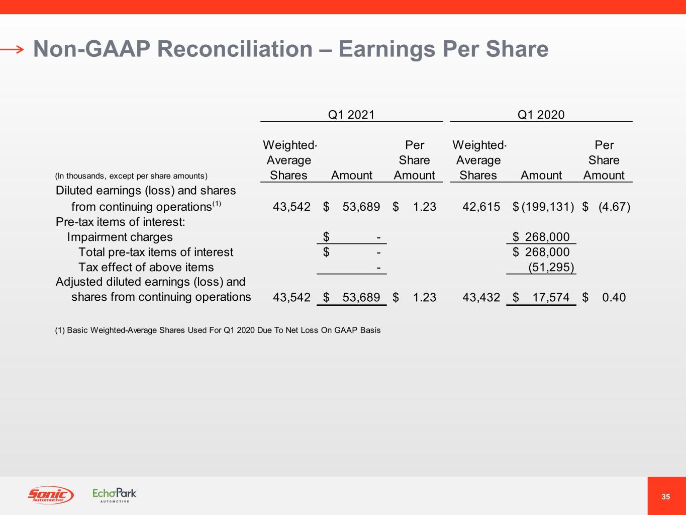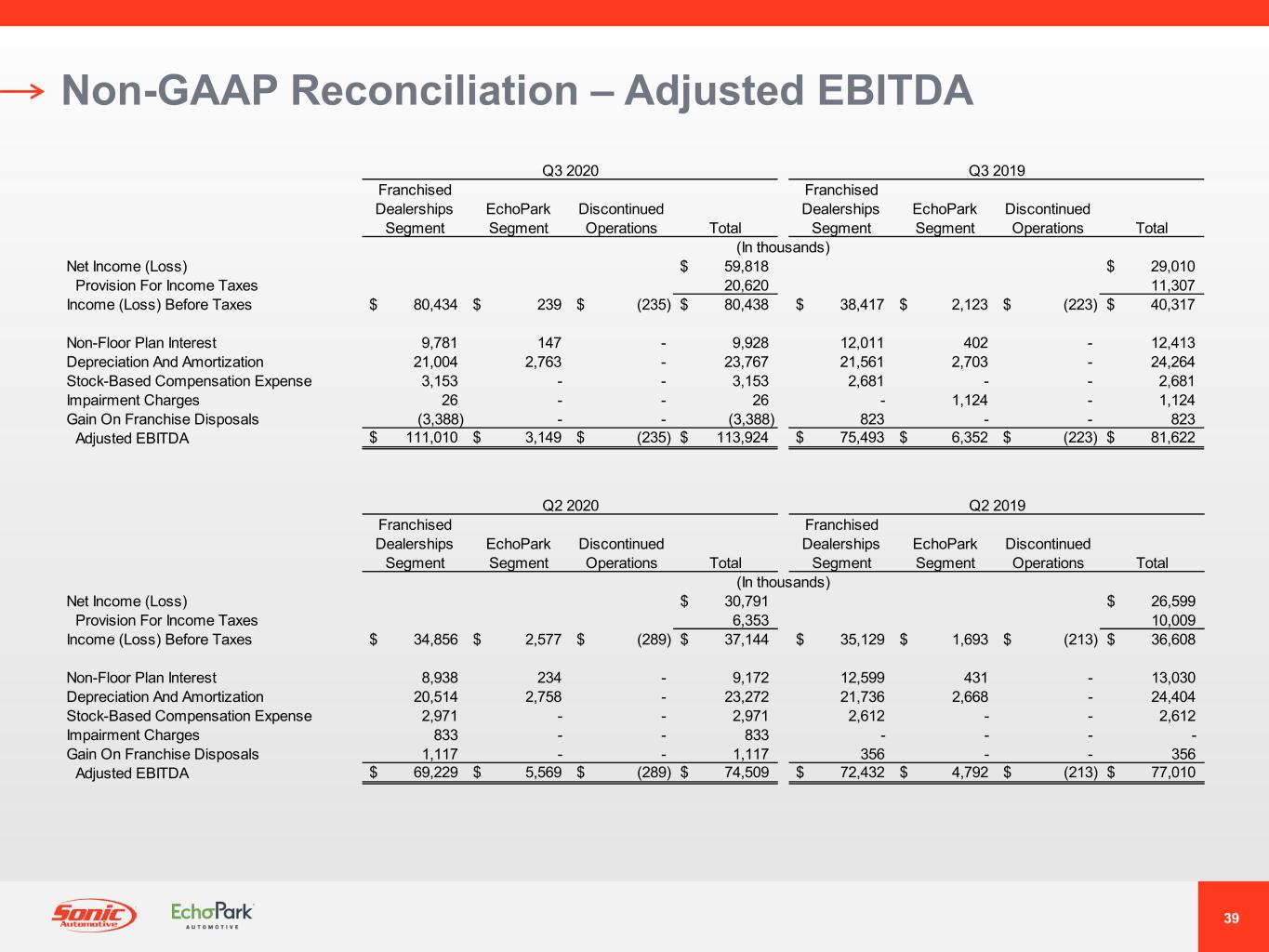 38 Non-GAAP Reconciliation – Adjusted EBITDA Franchised Dealerships Segment EchoPark Segment Discontinued Operations Total Franchised Dealerships Segment EchoPark Segment Discontinued Operations Total (In thousands) Net Income (Loss) $ 54,222 $ (199,333) Provision For Income Taxes 19,051 (44,200) Income (Loss) Before Taxes $ 70,543 $ 2,010 $ 720 $ 73,273 $ (245,344) $ 2,096 $ (285) $ (243,533) Non-Floor Plan Interest 9,127 334 - 9,461 10,043 365 - 10,408 Depreciation And Amortization 21,206 3,304 - 24,510 20,144 2,708 - 22,852 Stock-Based Compensation Expense 3,485 - - 3,485 2,427 - - 2,427 Impairment Charges - - - - 268,000 - - 268,000 Long-Term Compensation Charges - 500 - 500 - - - - Gain On Franchise And Real Estate Disposals (21) 14 - (7) - - - - Adjusted EBITDA $ 104,340 $ 6,162 $ 720 $ 111,222 $ 55,270 $ 5,169 $ (285) $ 60,154 Q1 2021 Q1 2020 Franchised Dealerships Segment EchoPark Segment Discontinued Operations Total Franchised Dealerships Segment EchoPark Segment Discontinued Operations Total (In thousands) Net Income (Loss) $ 59,376 $ 46,307 Provision For Income Taxes 30,208 14,703 Income (Loss) Before Taxes $ 90,611 $ (833) $ (194) $ 89,584 $ 75,466 $ (14,518) $ 62 $ 61,010 Non-Floor Plan Interest 8,963 201 - 9,164 12,335 435 - 12,770 Depreciation And Amortization 21,167 2,863 - 24,030 20,972 2,765 - 23,737 Stock-Based Compensation Expense 3,152 - - 3,152 2,690 - - 2,690 Impairment Charges 1,158 - - 1,158 1,075 16,617 - 17,692 Loss On Debt Extinguishment - - - - 6,690 - - 6,690 Gain On Franchise And Real Estate Disposals (821) (5,152) - (5,973) (29,242) - - (29,242) Adjusted EBITDA $ 124,230 $ (2,921) $ (194) $ 121,115 $ 89,986 $ 5,299 $ 62 $ 95,347 Q4 2020 Q4 2019