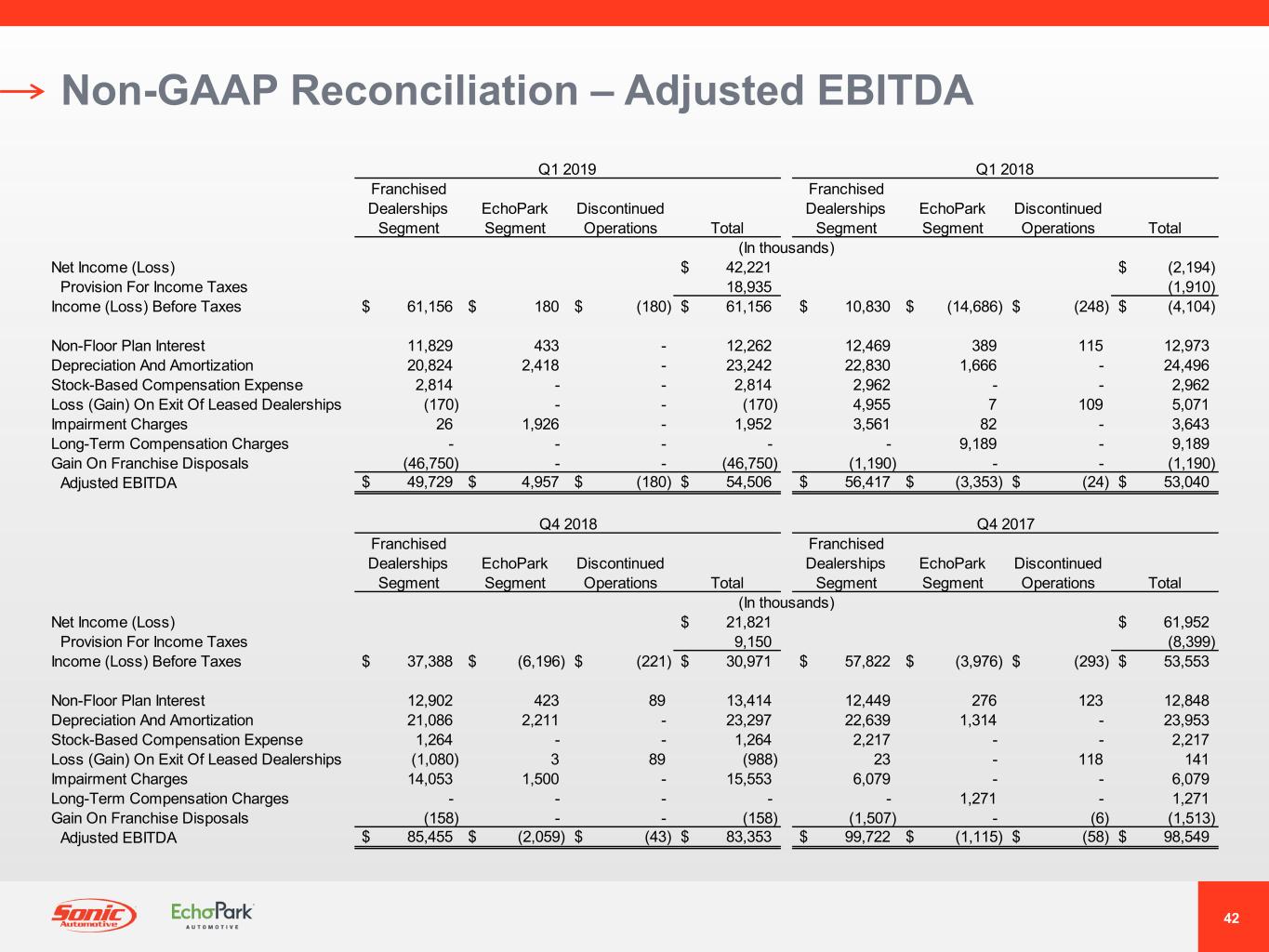 41 Non-GAAP Reconciliation – Adjusted EBITDA Franchised Dealerships Segment EchoPark Segment Discontinued Operations Total Franchised Dealerships Segment EchoPark Segment Discontinued Operations Total (In thousands) Net Income (Loss) $ 29,010 $ 15,118 Provision For Income Taxes 11,307 7,262 Income (Loss) Before Taxes $ 38,417 $ 2,123 $ (223) $ 40,317 $ 28,087 $ (5,455) $ (252) $ 22,380 Non-Floor Plan Interest 12,011 402 - 12,413 12,279 423 98 12,800 Depreciation And Amortization 21,561 2,703 - 24,264 22,140 1,999 - 24,139 Stock-Based Compensation Expense 2,681 - - 2,681 4,578 - - 4,578 Loss (Gain) On Exit Of Leased Dealerships - - - - 24 4 103 131 Impairment Charges - 1,124 - 1,124 - - - - Gain On Franchise Disposals 823 - - 823 88 - - 88 Adjusted EBITDA $ 75,493 $ 6,352 $ (223) $ 81,622 $ 67,196 $ (3,029) $ (51) $ 64,116 Franchised Dealerships Segment EchoPark Segment Discontinued Operations Total Franchised Dealerships Segment EchoPark Segment Discontinued Operations Total (In thousands) Net Income (Loss) $ 26,599 $ 16,905 Provision For Income Taxes 10,009 8,142 Income (Loss) Before Taxes $ 35,129 $ 1,693 $ (213) $ 36,608 $ 53,176 $ (27,832) $ (297) $ 25,047 Non-Floor Plan Interest 12,599 431 - 13,030 12,349 406 106 12,861 Depreciation And Amortization 21,736 2,668 - 24,404 22,801 1,919 - 24,720 Stock-Based Compensation Expense 2,612 - - 2,612 3,049 - - 3,049 Loss (Gain) On Exit Of Leased Dealerships - - - - (2,618) 6 106 (2,506) Impairment Charges - - - - 10,317 - - 10,317 Long-Term Compensation Charges - - - - - 23,333 - 23,333 Gain On Franchise Disposals 356 - - 356 (38,047) - - (38,047) Adjusted EBITDA $ 72,432 $ 4,792 $ (213) $ 77,010 $ 61,027 $ (2,168) $ (85) $ 58,774 Q3 2019 Q3 2018 Q2 2019 Q2 2018